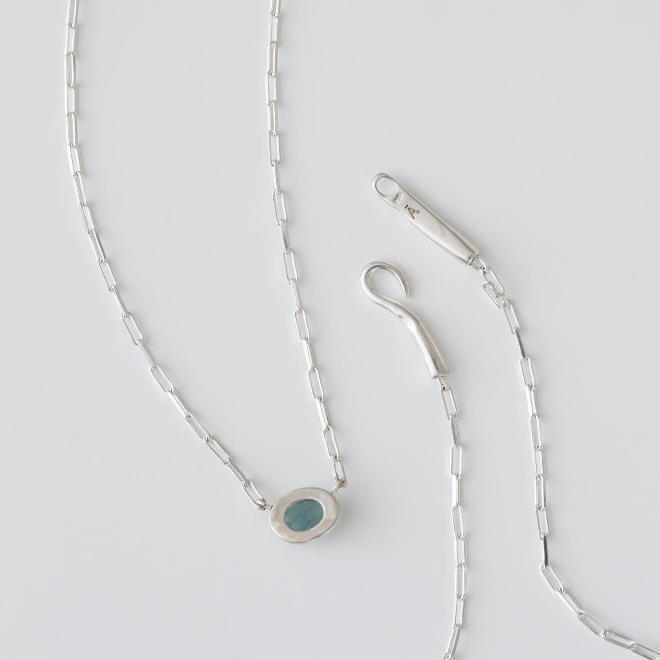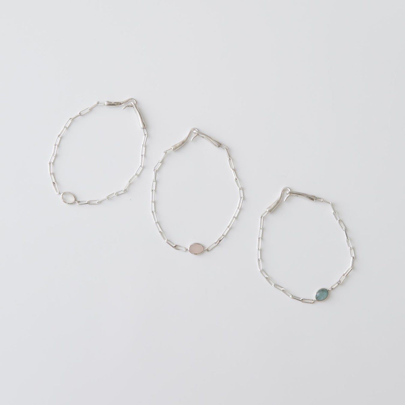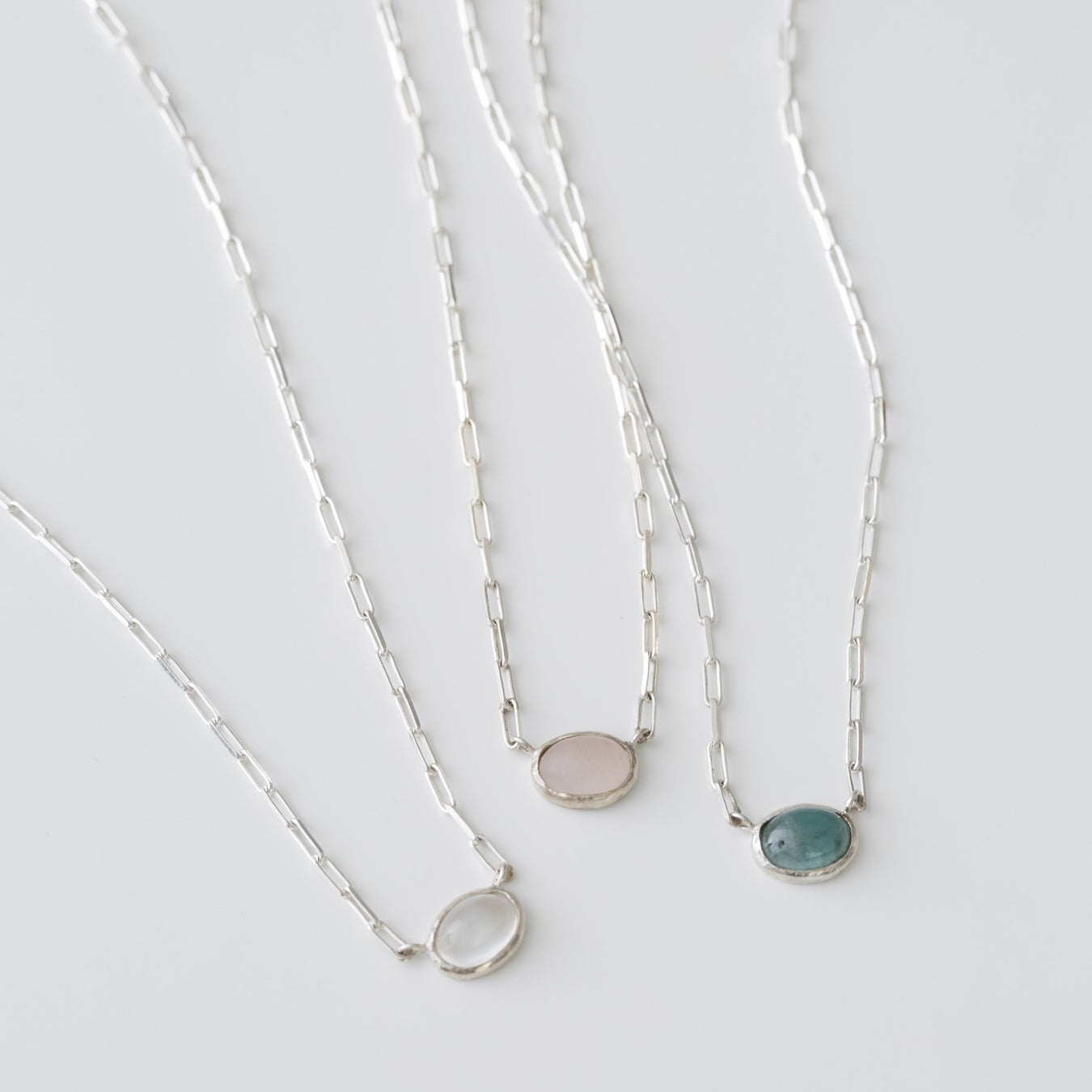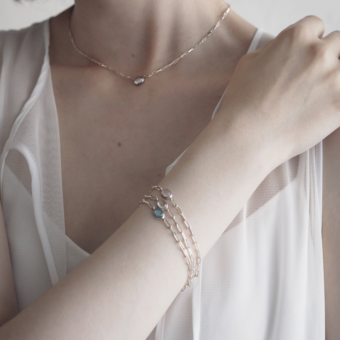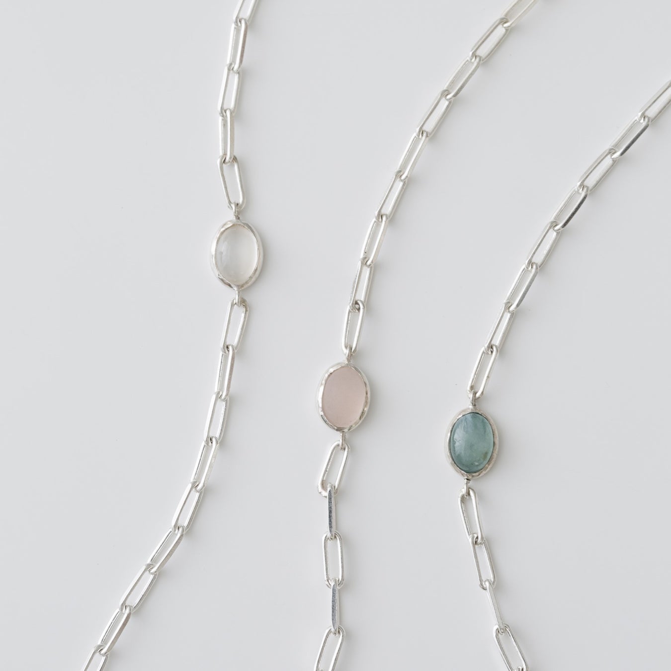 今回採用した天然石の中では一番透明感のある天然石です。見る角度によって光のラインが浮かび上がるのが魅力のムーンストーンは、胸元にさりげない艶感をプラスしてくれます。