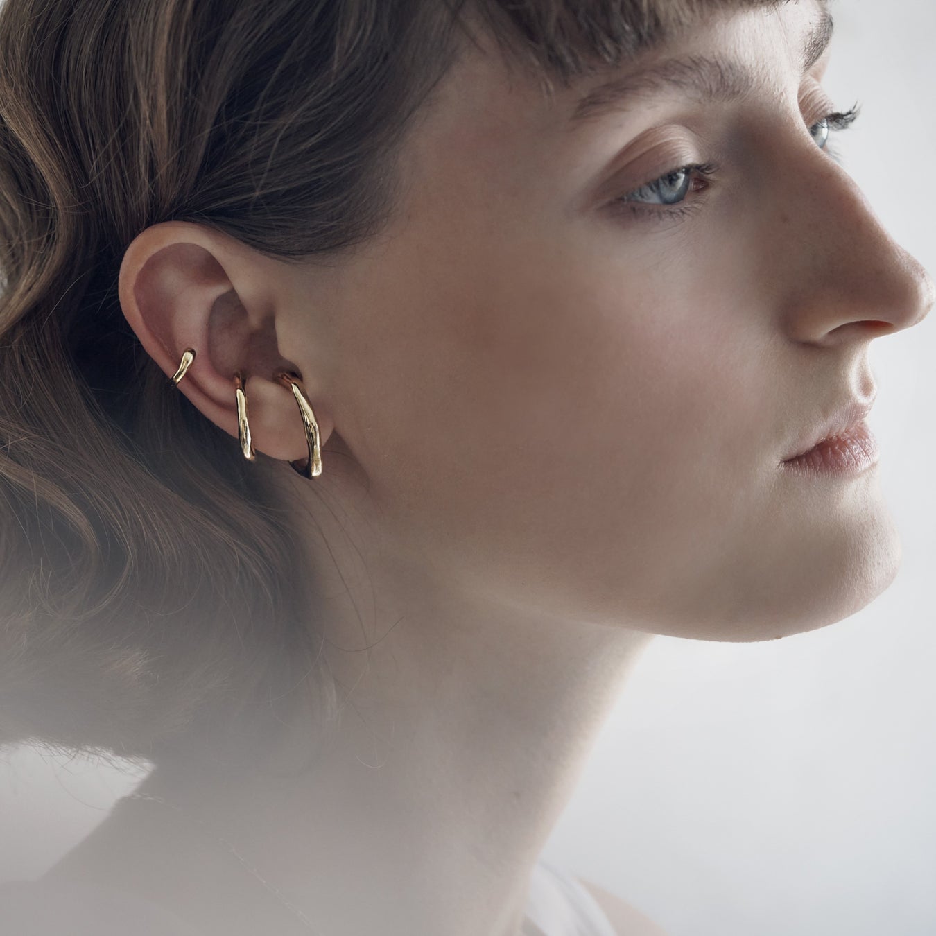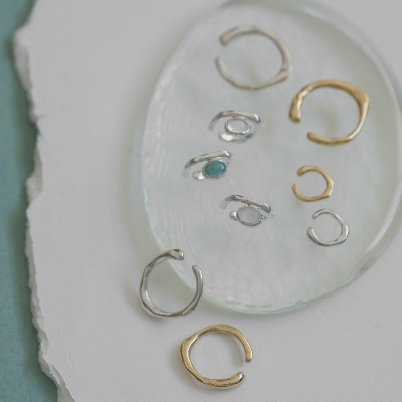 Flow Stone イヤーカフとの重ね付けが楽しめるよう、 “Simple、Narrow、Wide”の3つのサイズ違いでイヤーカフもお作りしました。こちらはそれぞれシルバーとゴールドの2色展開です。