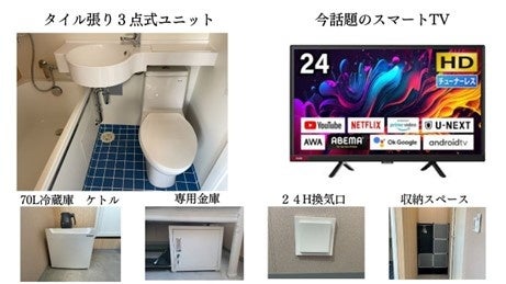「お家にいるような快適空間」をコンセプトに冷蔵庫や収納ラックなどコンパクトな部屋に不便なく生活できる設備を完備。