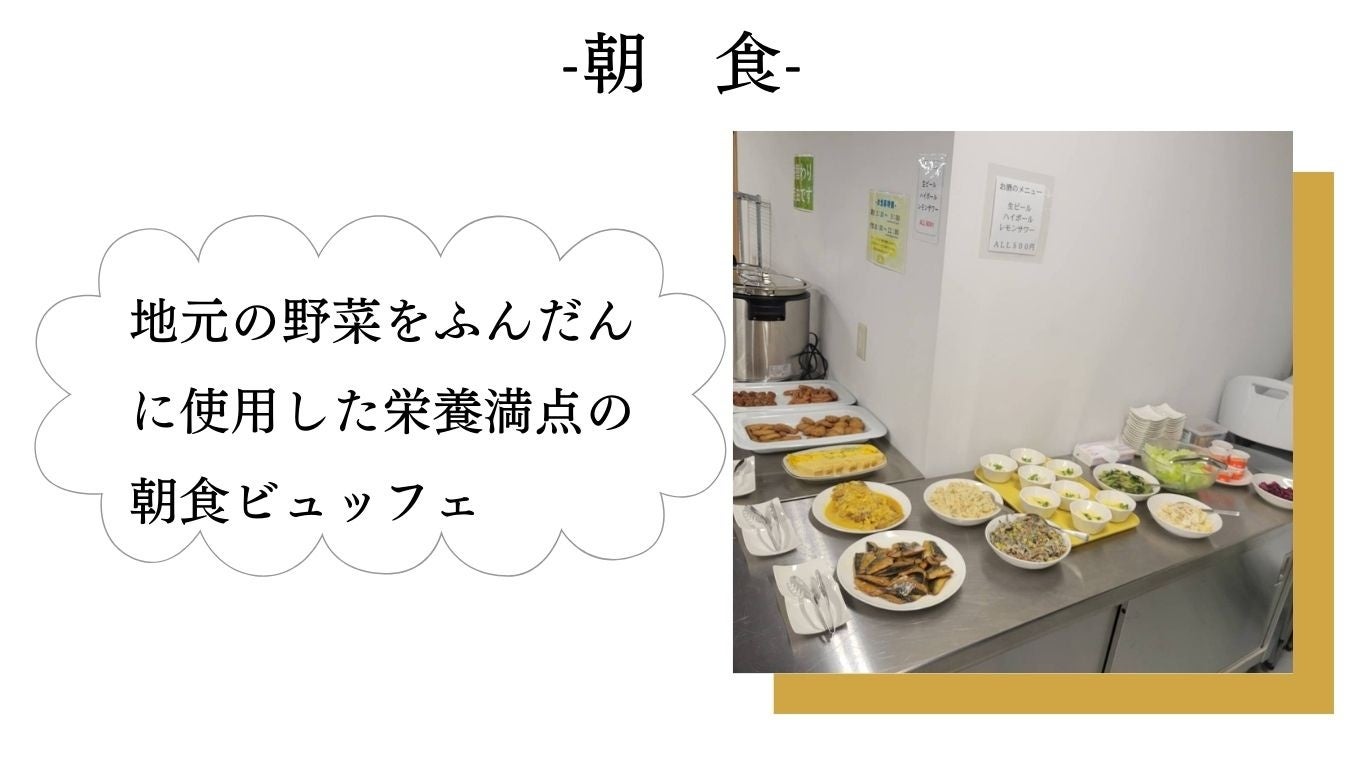 また、地元の野菜をふんだんに使用した朝食ブッフェや、日替わり弁当や定食などの食事サービスもご提供いたします。