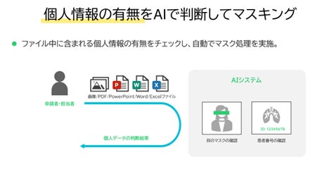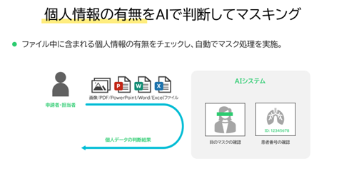 こうした背景をうけ、IDはAI技術を活用して、個人情報を識別しマスキングするソフトウェアを開発しました。このソフトウェアは自動的に顔写真の目元やレントゲン写真に含まれる患者番号を識別し、必要に応じてマスキング処理を行います。画像処理に特化したAI技術を使用することで、顔写真の目元や患者番号のプライバシーを守ります。また、画像ファイルだけではなく、PDF、PowerPoint、Excel、Wordファイルにも対応しており、幅広い個人情報保護を提供しています。