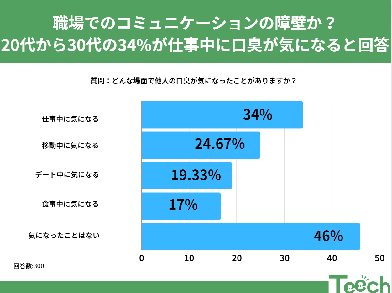 アンケートによると、20代から30代の男女のうち34%が仕事中に他人の口臭を気にすると回答しました。これは、職場での口臭が個人のキャリアや社内でのコミュニケーションに悪影響を及ぼす可能性があることを示唆しています。