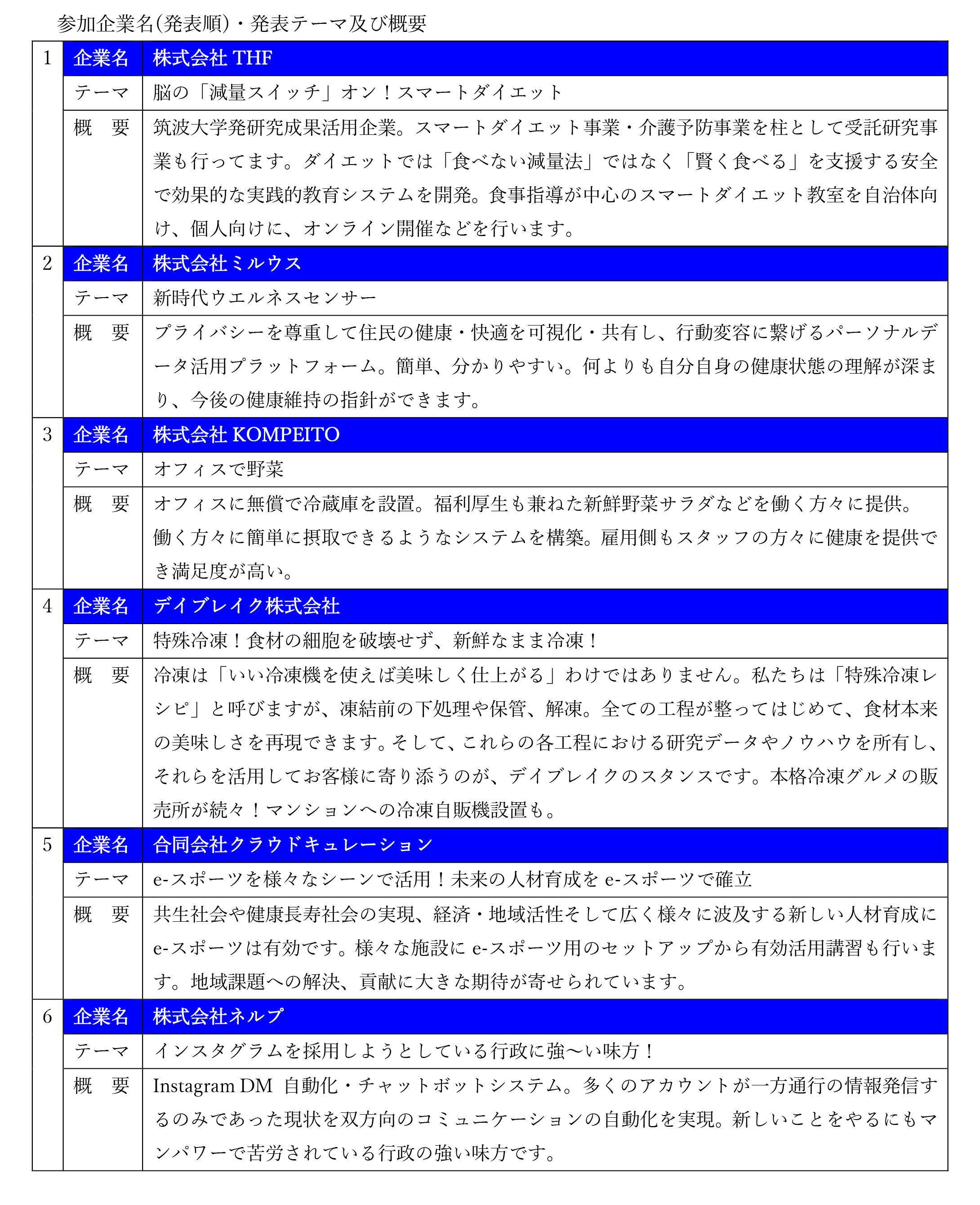 今回、参加した6社の企業名及び発表テーマ・概要についてはこちらからご覧いただけます。