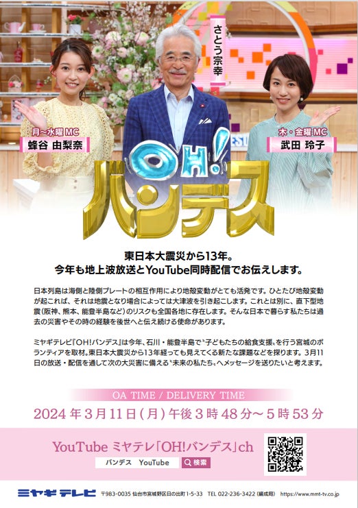 東日本大震災の被災地の放送局である株式会社宮城テレビ放送(ミヤギテレビ、仙台市宮城野区 日本テレビ系)では、毎年3月11日前後に震災からの復興と次の災害への備えをテーマにした番組を制作しています。2022年からは報道特別番組と、夕方の情報番組「OH!バンデス」の2番組の生放送とYouTube配信を実施しており、震災から13年になる今年も生放送とYouTubeライブ配信を行い、全国に発信します。