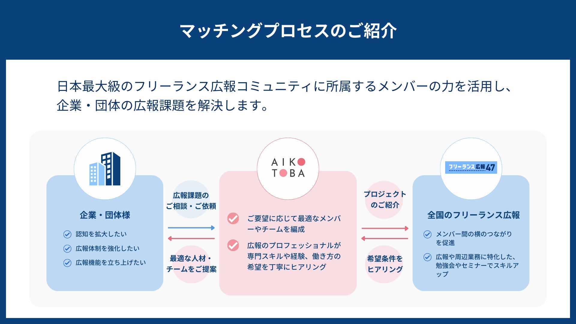 これまでも「フリーランス広報47」の活動の中で、企業とフリーランス広報をつなぐマッチングを個別に行ってきました。