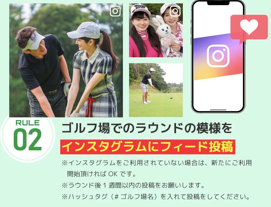 *1 ※キャディーフィー、ゴルフ税、飲食代等は別途ゴルフ場ごとに発生します。Instagram(今後、対応SNSは増える可能性があります)でラウンド風景を投稿できる会員様に限ります。※ご同行者様2名以上を伴ってのラウンドが必須です。(2サムプレイは除く)※ご同行者様のプレー費用は別途各ゴルフ場の料金体系に応じて通常通り発生いたします。