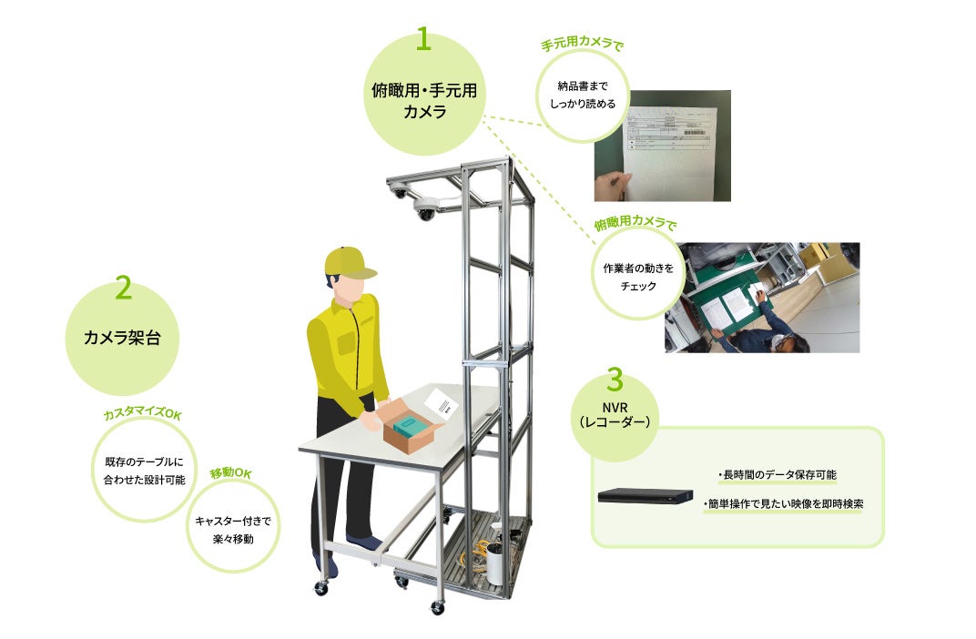 作業者の手元を映す手元カメラと、全体の動きを映す俯瞰カメラがセットになった作業台です。