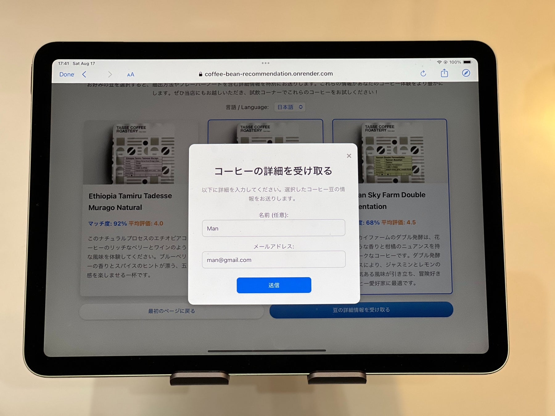 これは、CoffeeMatch AIプログラムの最初のバージョンに過ぎません。私たちは、お客様のフィードバックを取り入れ、推奨ロジックに反映させることで、継続的な改善を目指しています。また、お客様は選んだ豆に関する詳細な情報をメールで受け取ることができ、嗜好を記録し、コーヒーの知識を深めることができます。