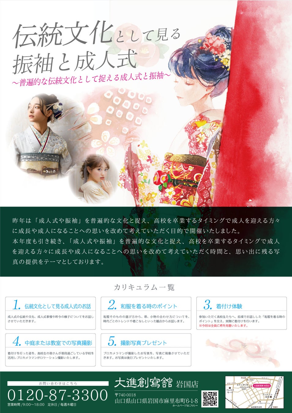 株式会社大進創寫舘岩国店は、人生の節目となる成人式や振袖についてを継承していく大切な文化と捉えております。