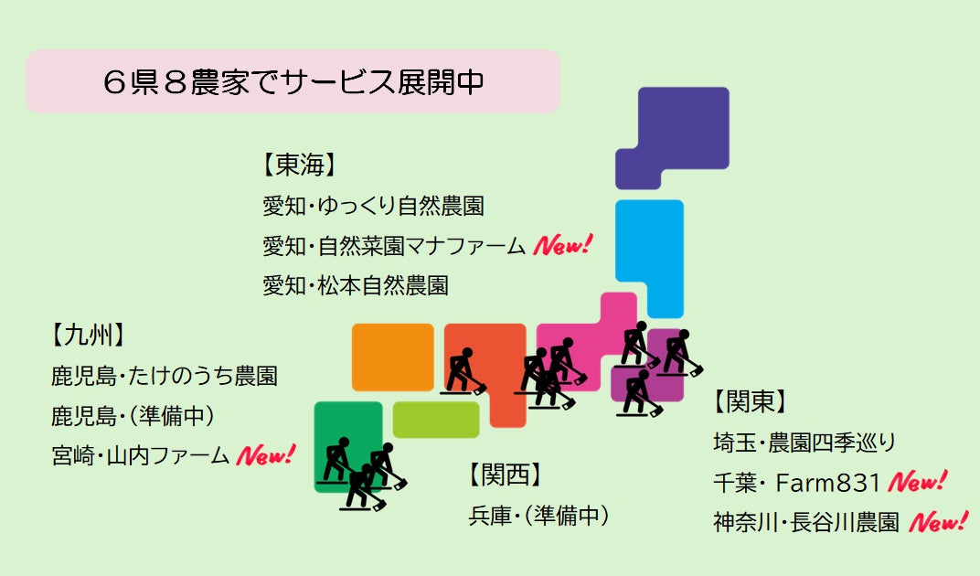 野菜の収穫が最盛期を迎える11月に千葉県千葉市・神奈川県相模原市・愛知県日進市・宮崎県小林市で新規オープンし、埼玉県と鹿児島県を含めた全国6県でサブスク型の収穫体験を提供します。