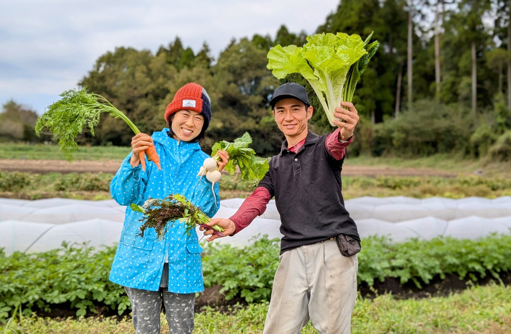 周りを山に囲まれた自然豊かな場所でのびのびと野菜を育てる農家。夫婦の人柄で「ココへ帰ってきた感」が味わえる場所。