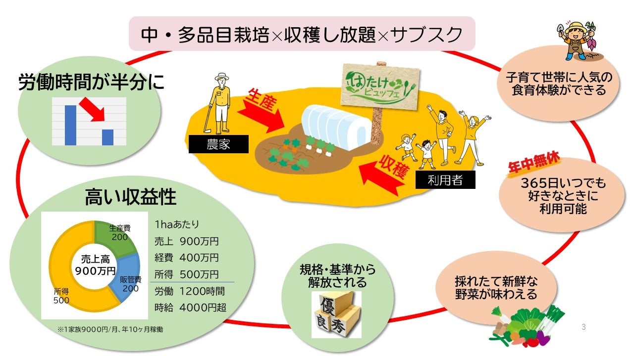 「はたけビュッフェ」は、月定額で野菜が365日採り放題になる収穫サブスクサービスです。農家は畑で野菜を生産し、消費者はそこから自分で野菜を収穫します。