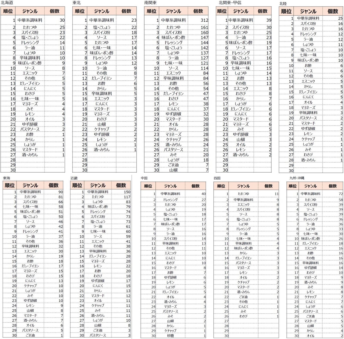 どのエリアでもダントツのトップが中華調系味料だが、県別で見ることで「中華街がある→中華系調味料を使う頻度が高い」ことが証明されるかもしれません。