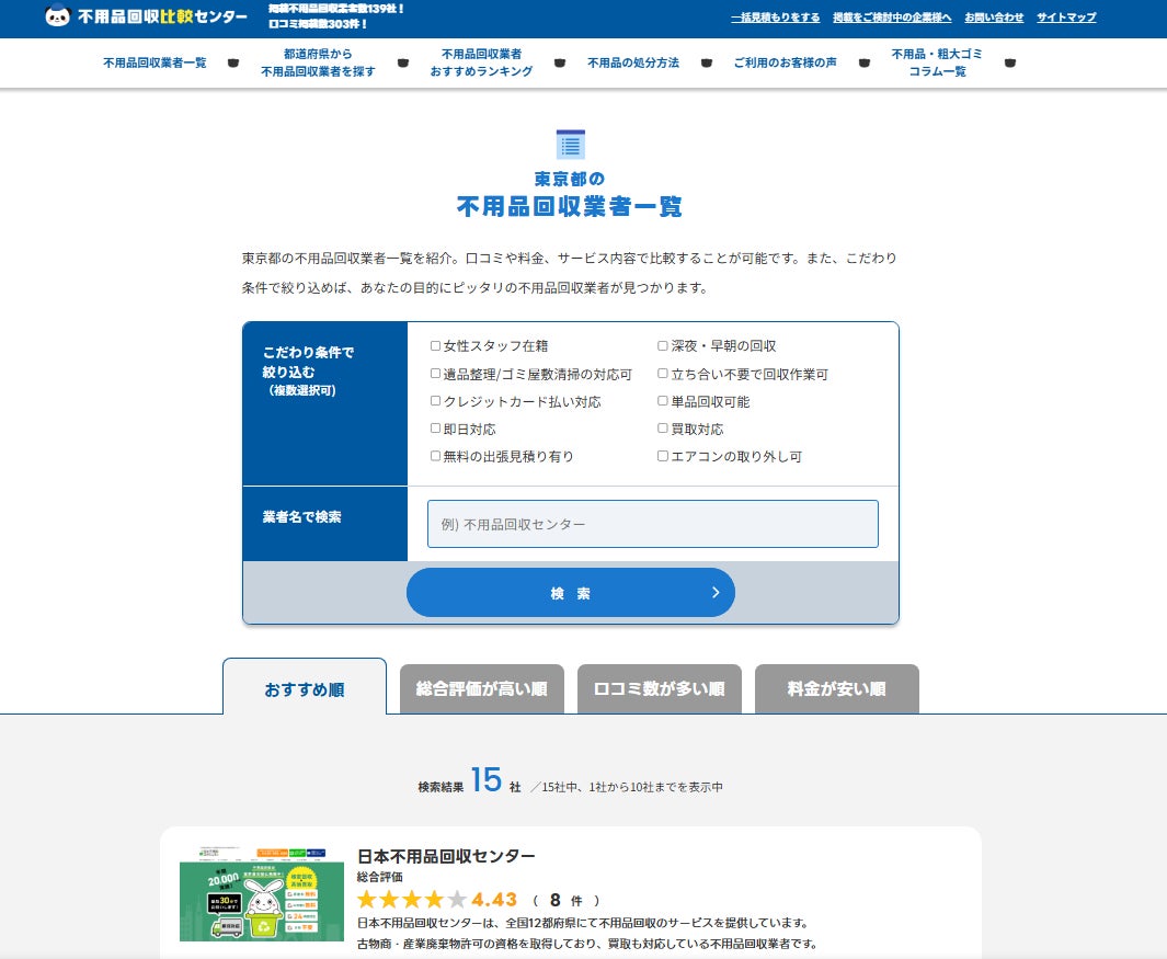 株式会社Blitzが運営する不用品回収比較センターは、2025年3月24日に東京エリアの掲載業者数が15社を突破しました!