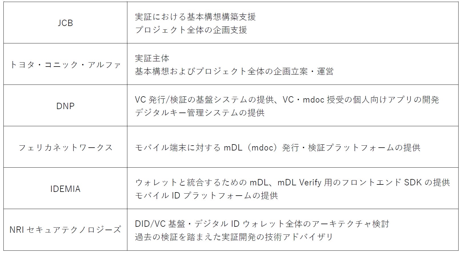 この実証には、大日本印刷株式会社(DNP)、フェリカネットワークス株式会社(フェリカネットワークス)、IDEMIA、NRIセキュアテクノロジーズ株式会社(NRIセキュアテクノロジーズ)の4社が実証パートナーとして参画します。