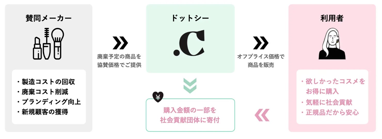 協賛企業(化粧品メーカー)は廃棄の削減につながり、利用者はお得に商品を購入できるだけでなく購入金額の一部が寄付されることで社会貢献につながります。
