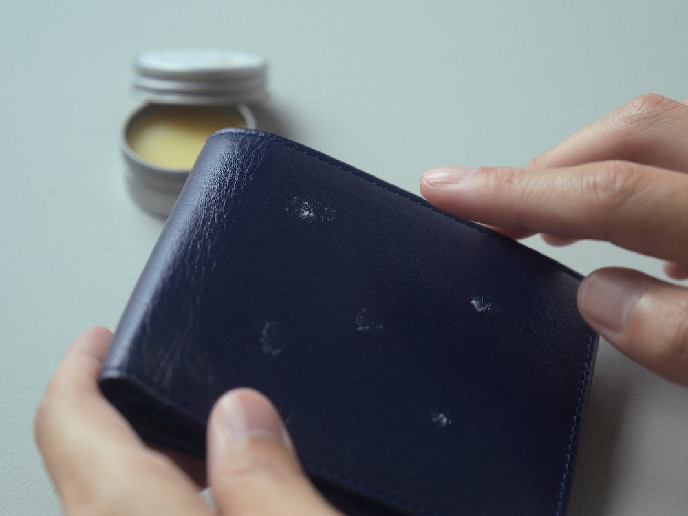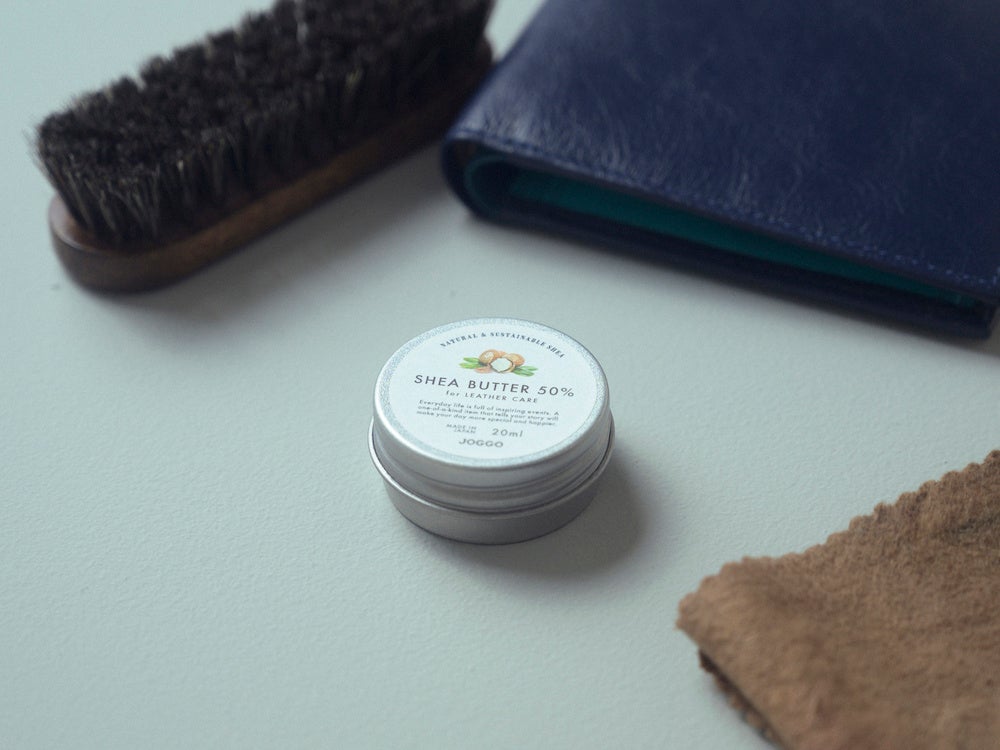「シアバター50%レザーケアクリーム」はアフリカの一部地域でのみ採れる天然成分シアバターを50%と高配合し、石油・化学成分、合成香料不使用のナチュラルでサスティナブルなレザーケアクリームです。自然成分で作られているため肌にも優しく、自然本来の香りをお楽しみいただけます。本クリームで革製品はケアをすることでツヤ出し保湿を与えるだけではなく撥水加工もでき、革製品がより長持ちするようになります。一回に取る分量で財布に塗るイメージ