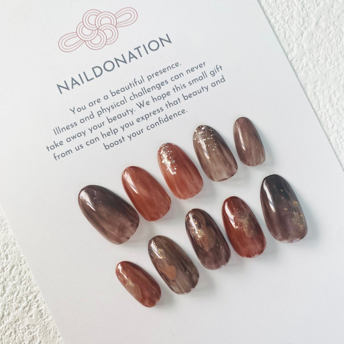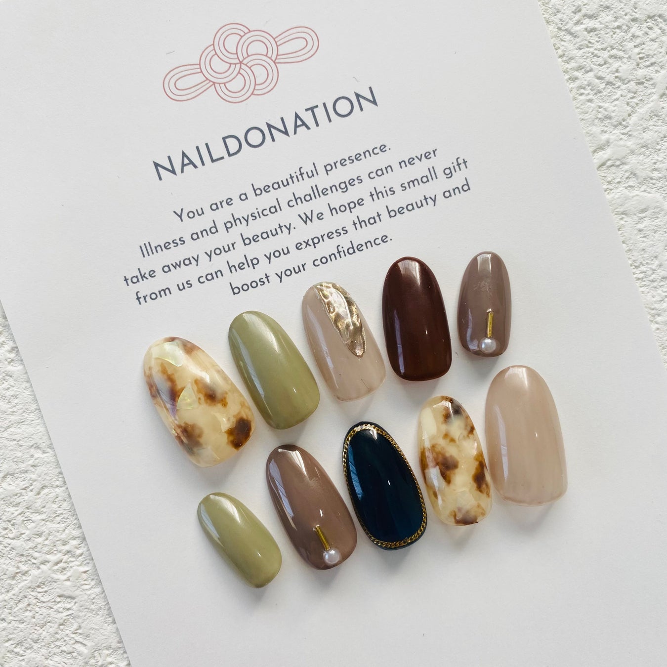 ネイルサロンから寄付されるネイルチップは大半が5本1セットのため、5本+5本を混ぜて組み合わせて10本セットにします。例えば①であればピンクとホワイトのデザインを混ぜ合わせたもので統一感があります。また、②③に関してはブラウンを組み合わせるとさらに統一感が出ます。④のように違う色合いを合わせても日本らしい曖昧で繊細な、今はやりのニュアンスデザインに生まれ変わることができます。
