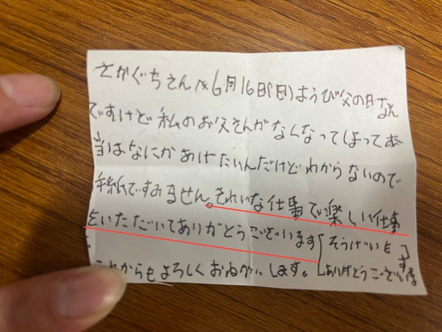 実際に働くご利用者様からの手紙には「きれいな仕事で楽しい仕事をいただいてありがとうございます」との記載がありました。