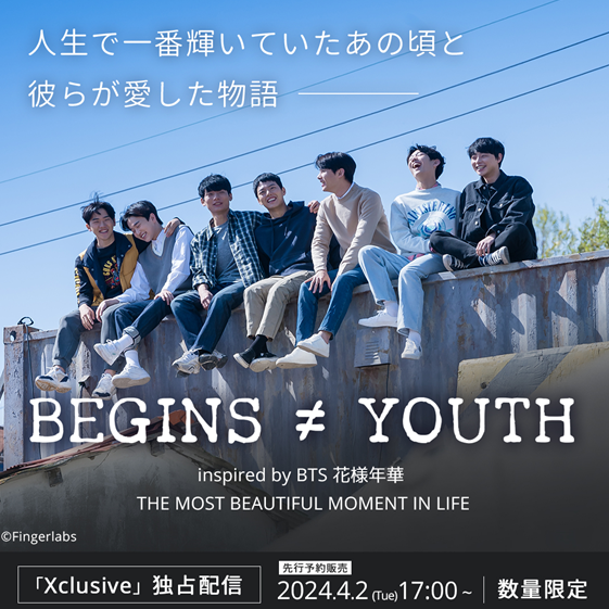 『BEGINS≠YOUTH』は、チョロクペムメディアとHYBEの共同制作で世界的に有名なK-POPアイドルグループ防弾少年団(BTS) 「BTSの花様年華(かようねんか)」フィクション(虚構)ストーリーを基にした二次創作ドラマだ。 字幕は日本語をはじめ、韓国語、英語、スペイン語、インドネシア語など、計5か国語で配信される。4月30日より「Xclusive」で独占配信開始。