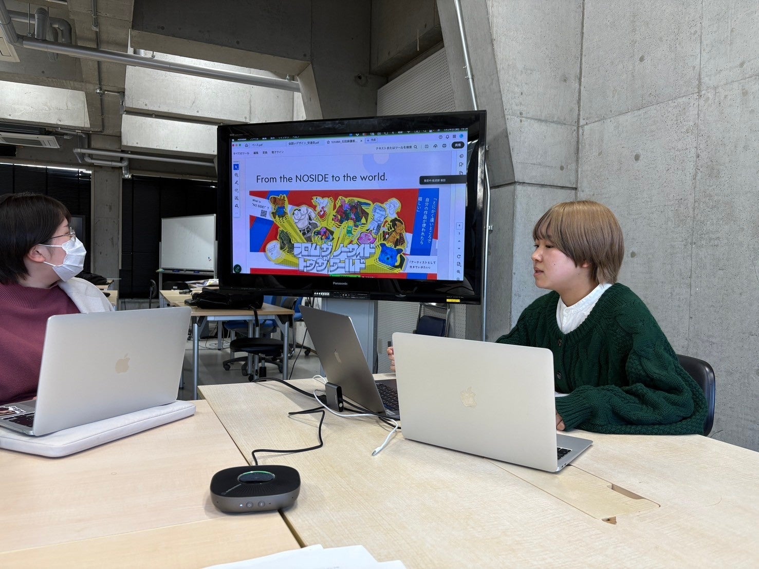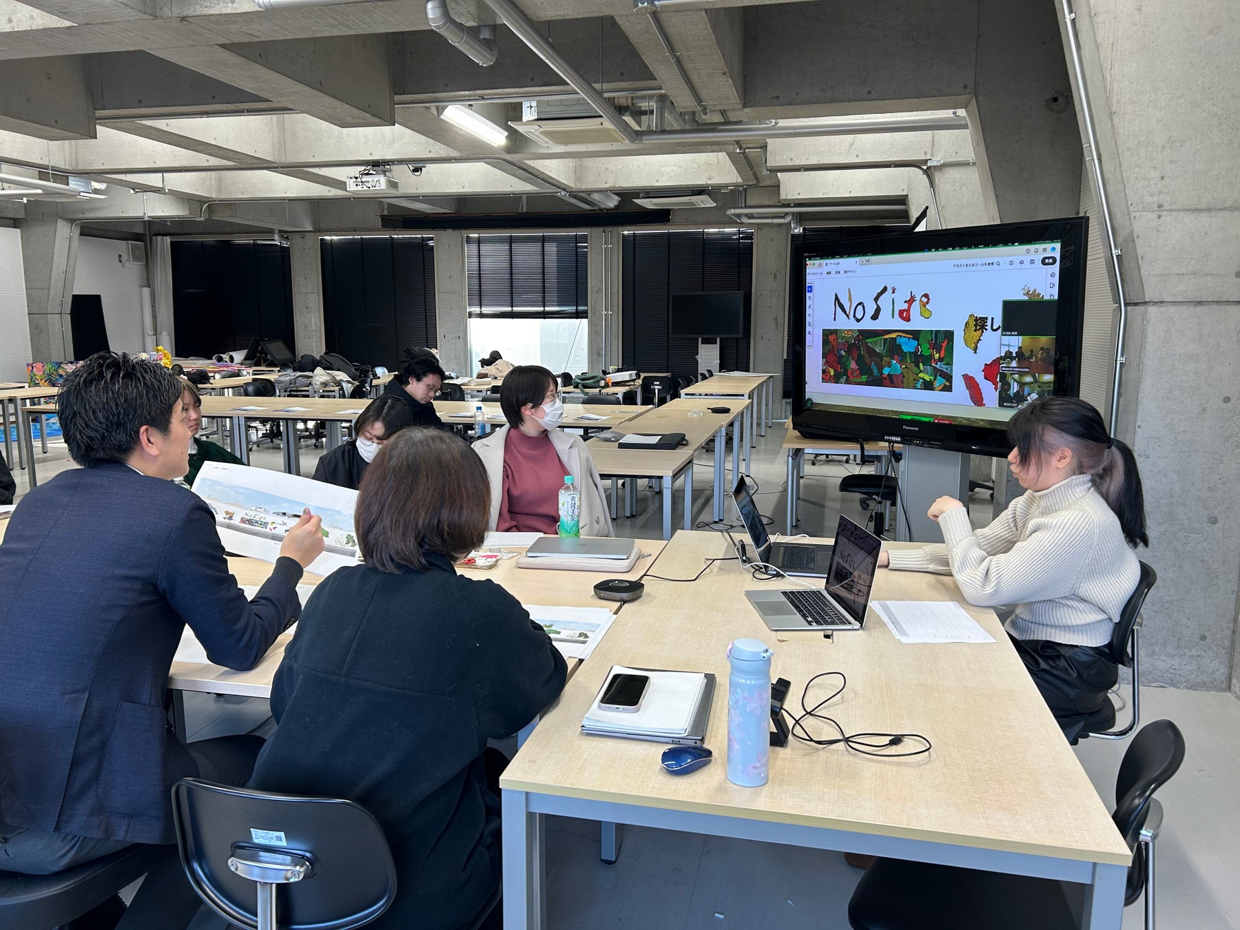 京都芸術大学の学生がノーサイドSTUDIO(重症心身障がい者施設)のアート作品を活用し、建築現場の仮囲いをデザイン。授業の課題として、デザインの力で街の景観に新たな価値をもたらすことに取り組みました。課題の発表会の様子です。