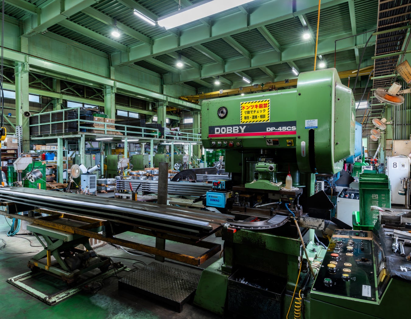 弊社では、大型プレス機7台、電気炉、焼戻し槽、洗浄・冷却槽、マルチフォーミングマシーン5台を有し、プレスから焼き入れまでを社内で一貫生産しています。プレス機がリズムよくシャンクを打ち抜く様子や、電気炉から2箇所の槽へコンベアーで流れるように移動する様子をご覧いただけます。またそれぞれの持ち場で働く専門の職人たちにもぜひ注目していただきたいです。