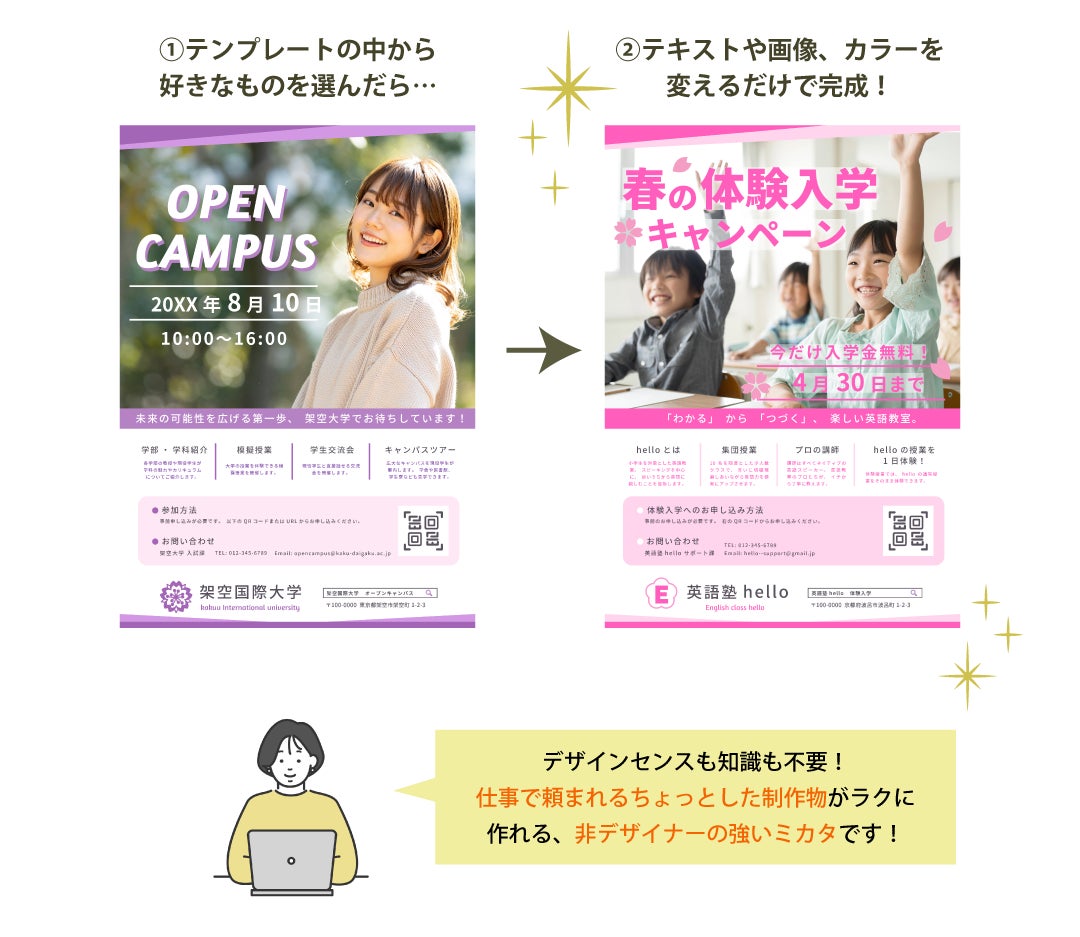 作りたいもののテンプレートを選んだら、画像やテキストを差し替えるだけ。だからデザインセンスや専門知識がなくても、ハイクオリティな制作物が誰でもカンタンに作れる、というわけです。