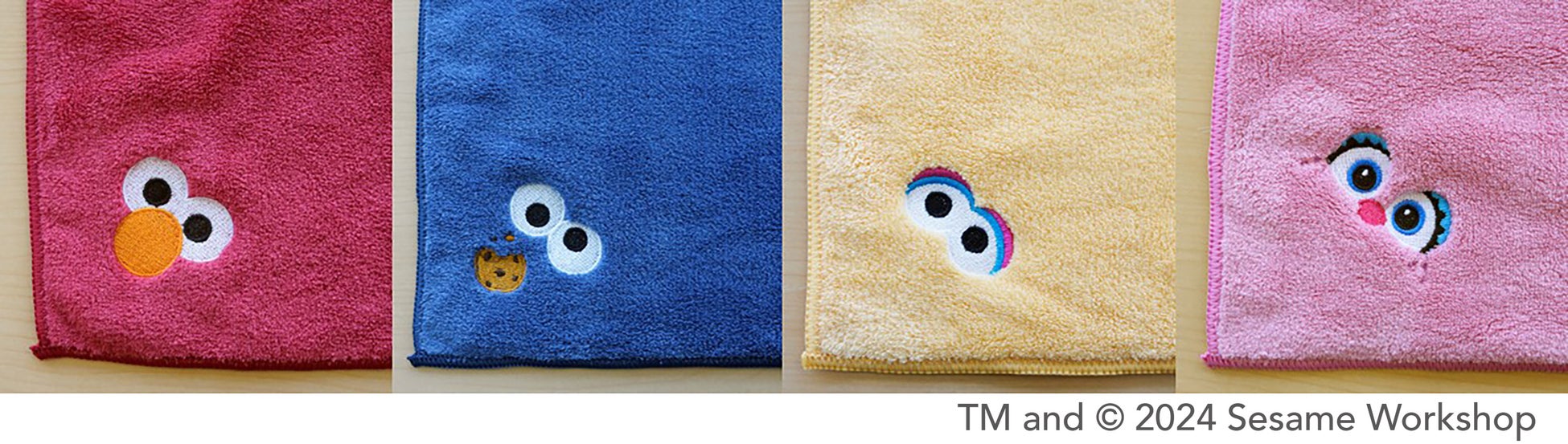 今回は、その中でも人気のエルモ、クッキーモンスター、ビッグバード、アビーがタオルでワンポイントの刺繍になって登場します。それぞれのキャラクターカラー4色で展開いたします。さらに、キャラクターの魅力をちりばめたポップでキュートなパッケージデザインもお楽しみいただけます。