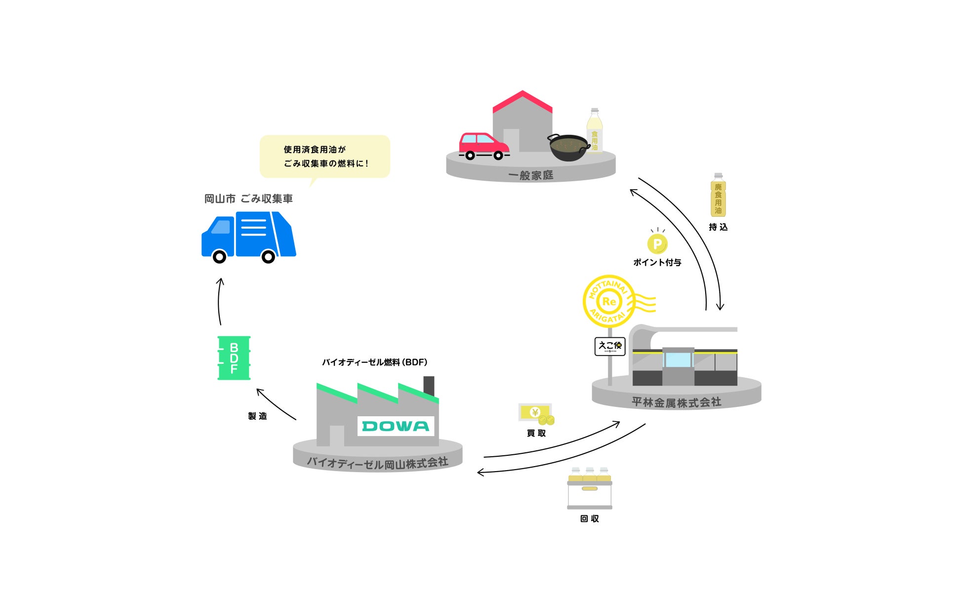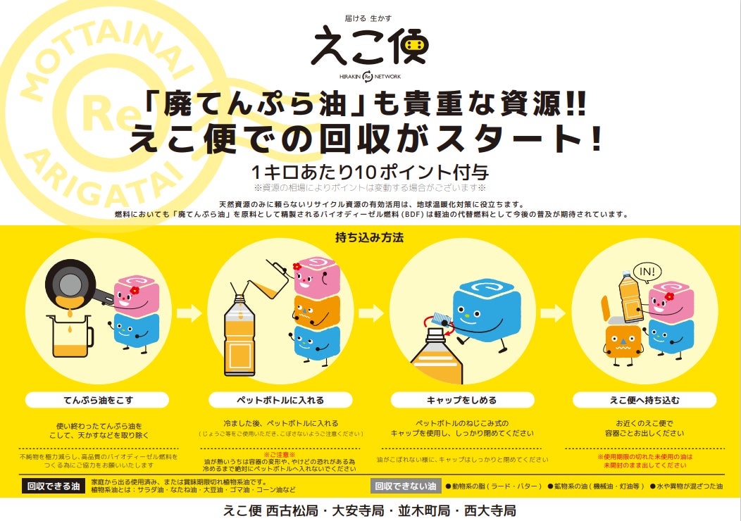 平林金属株式会社(本社 岡山市)とDOWAグループのバイオディーゼル岡山株式会社(本社 岡山市)は、2024年4月1日より、平林金属が運営する「えこ便」岡山市内店舗(4拠点)において、ご家庭の使用済み食用油の回収を共同でスタートさせました。バイオディーゼル岡山では2009年の設立以降、岡山市と共同で廃食用油を回収し、バイオディーゼル燃料(Bio Diesel Fuel「以下 BDF」)を製造・販売しています。製造されたバイオディーゼル燃料は、岡山市のごみ収集車で活用されています。