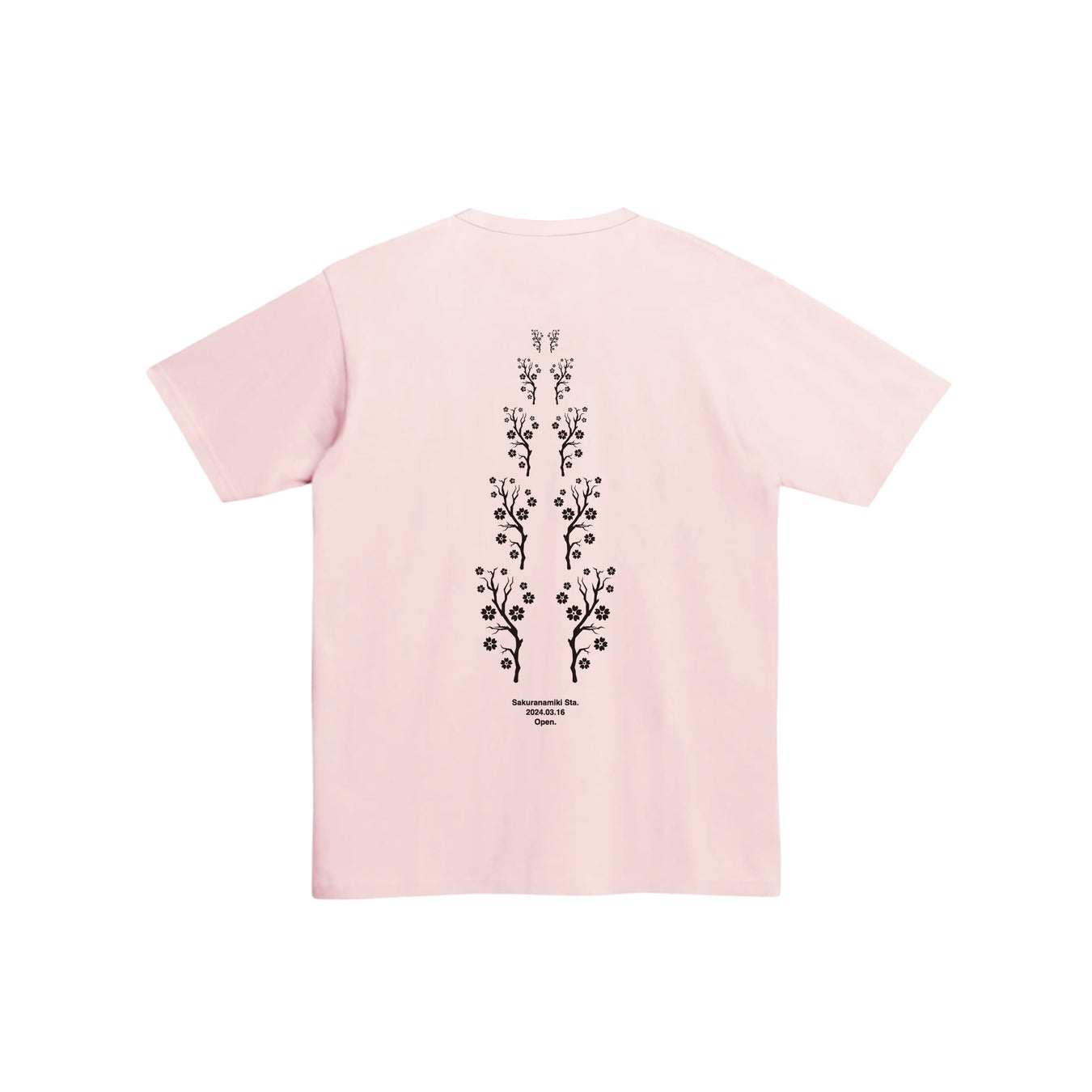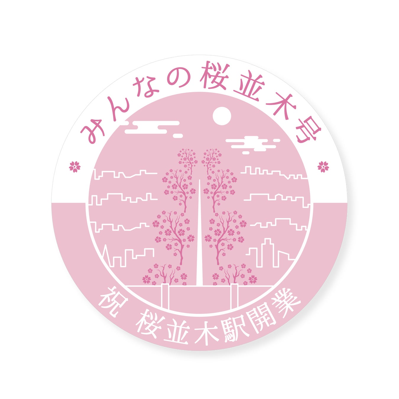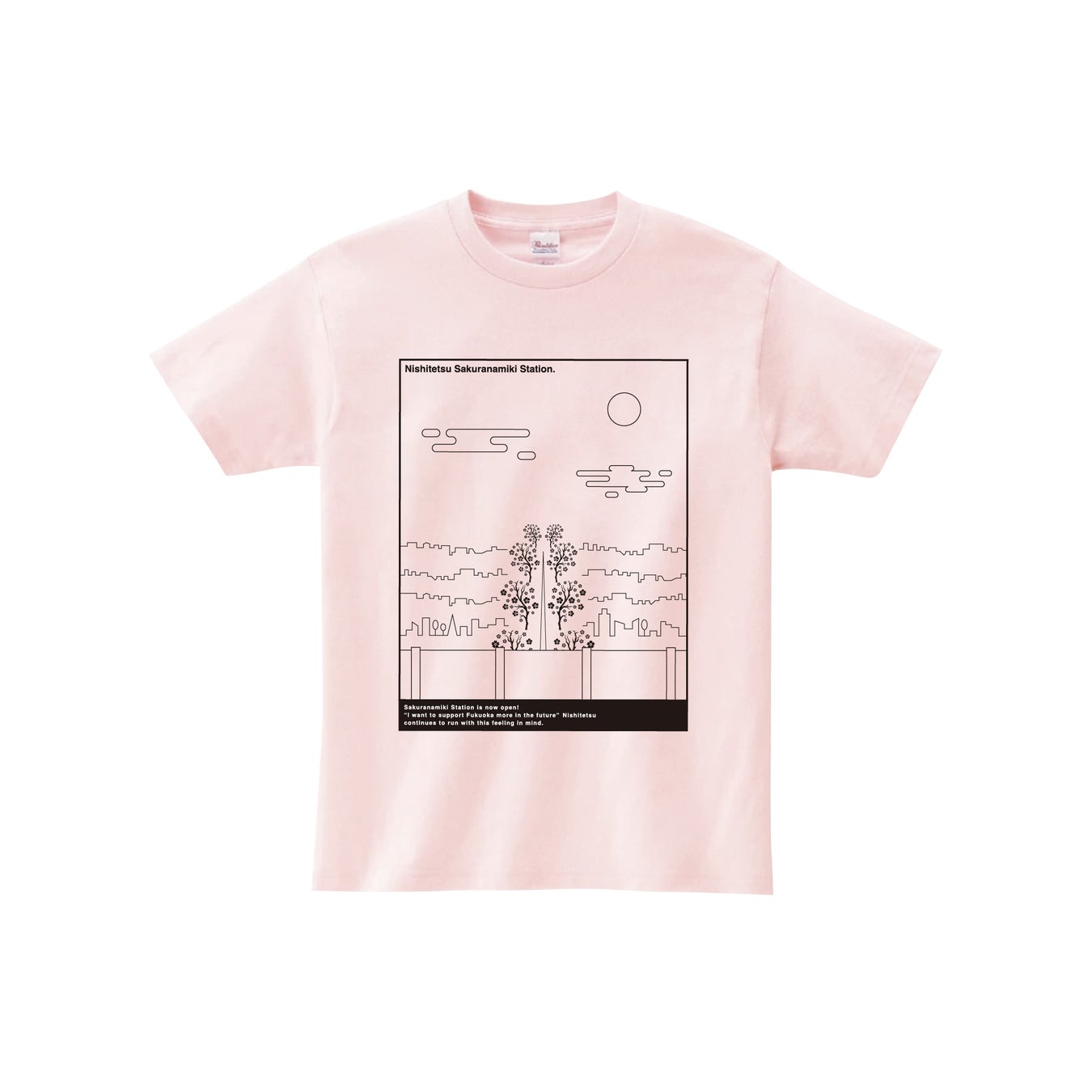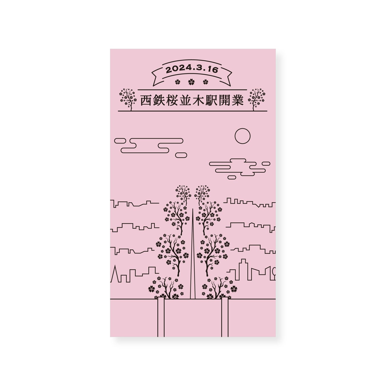西鉄天神大牟田線の車窓から見える桜並木の風景からインスピレーションを得ました。桜並木通りの並木道を線画で抽象的に表現し、メインとなる桜の木々をシルエットで、街並みを細い直線で描いています。