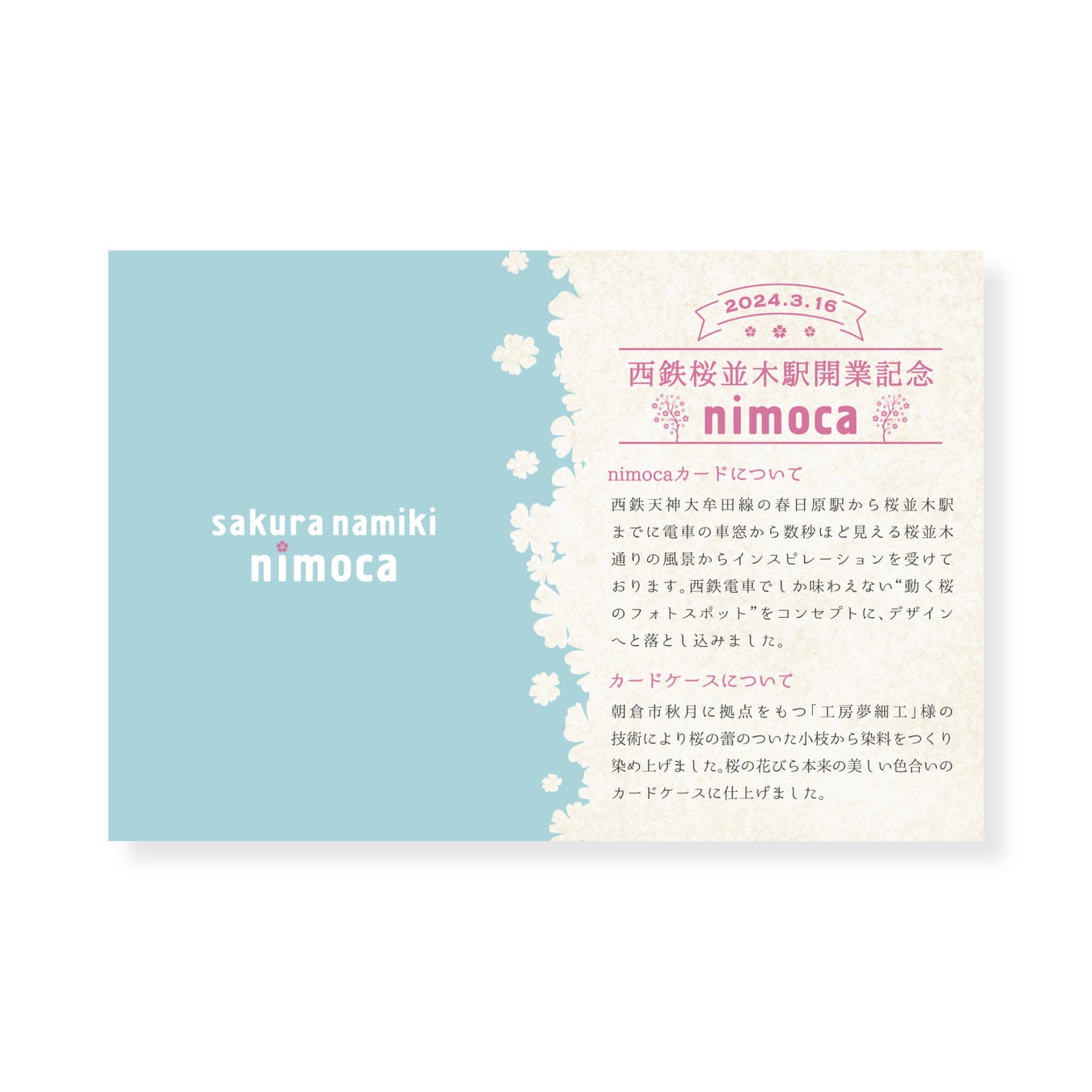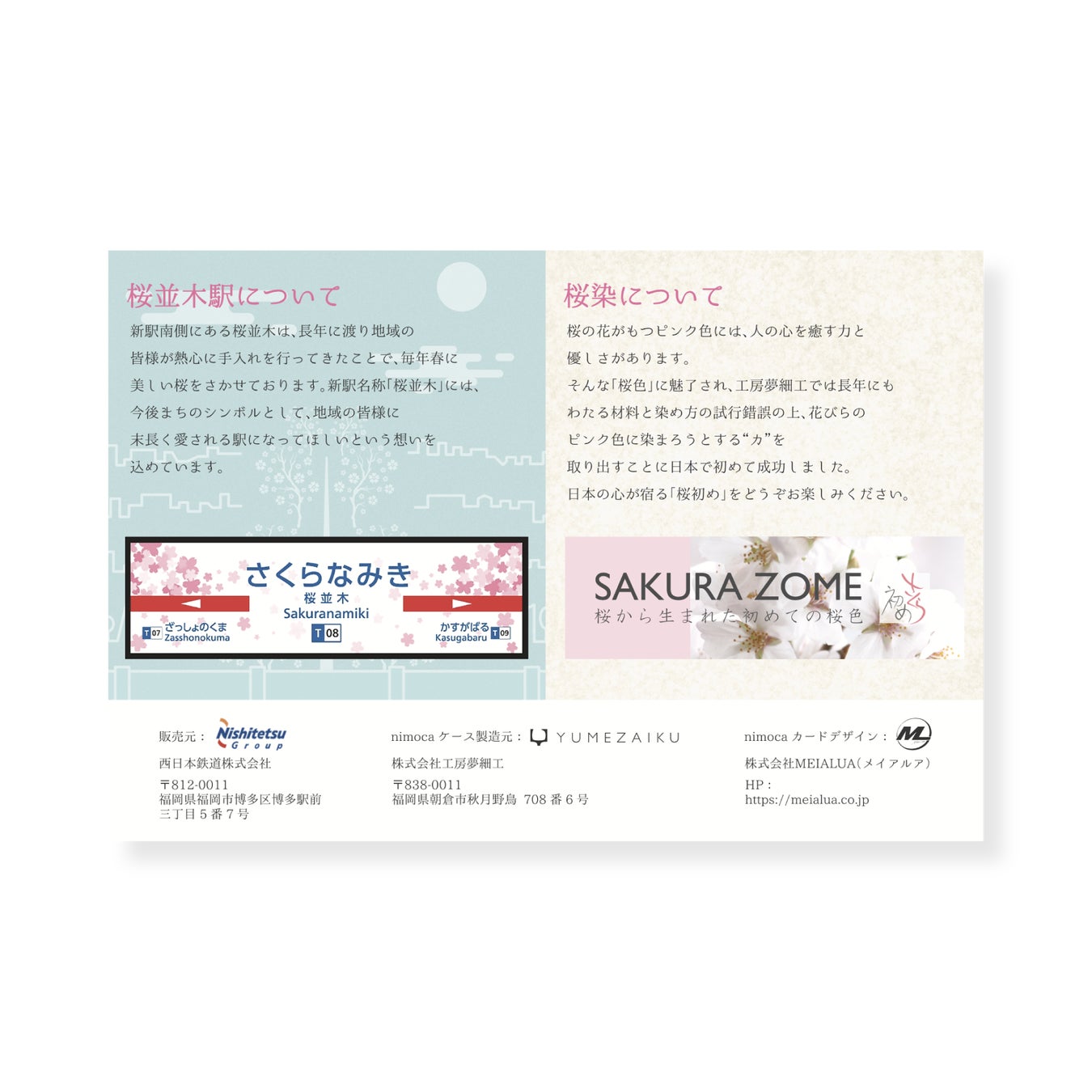 株式会社MEIALUA(メイアルア)は、2024年3月16日に開業した西鉄桜並木駅におけるnimocaカードや電車ラッピング、Tシャツなどのキービジュアルを、企画からデザインまで担当しました。