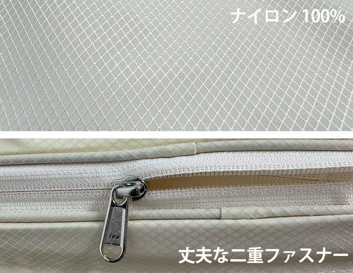 品質の高い素材なので軽くて丈夫、水や汚れにも強い。こだわったファスナーはYKKを採用し、滑らかなのでストレスなしに使えます。