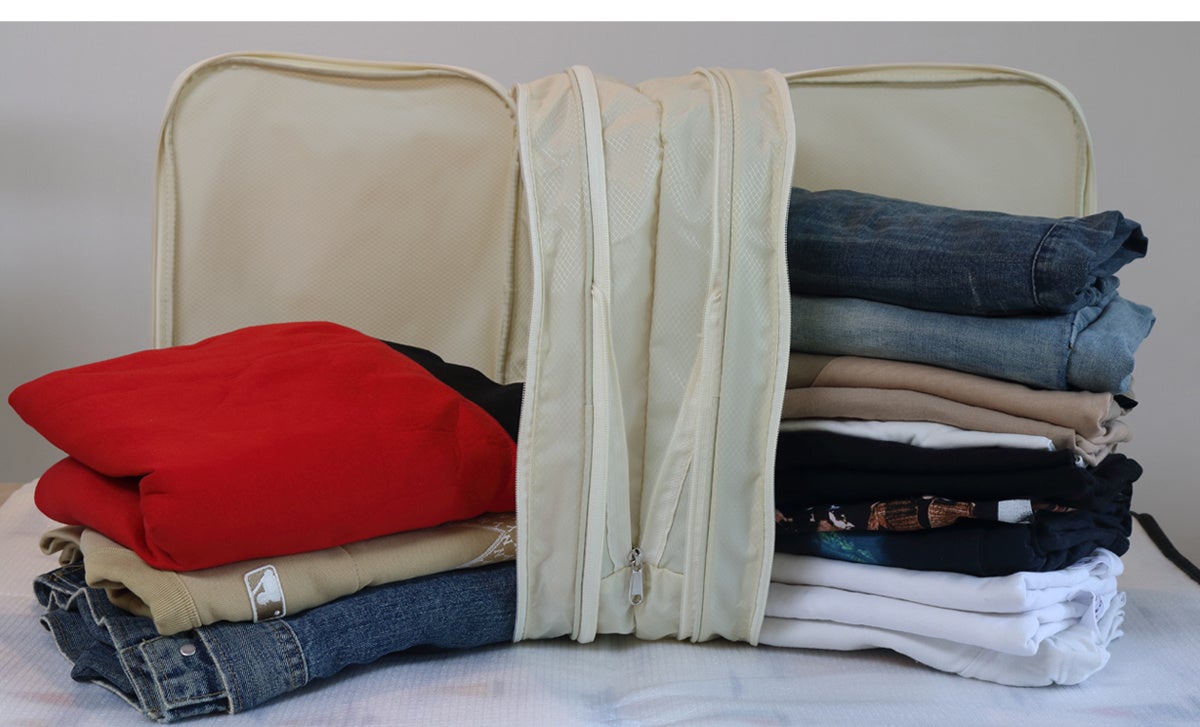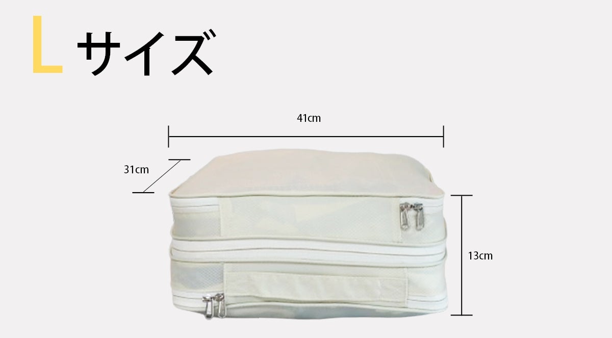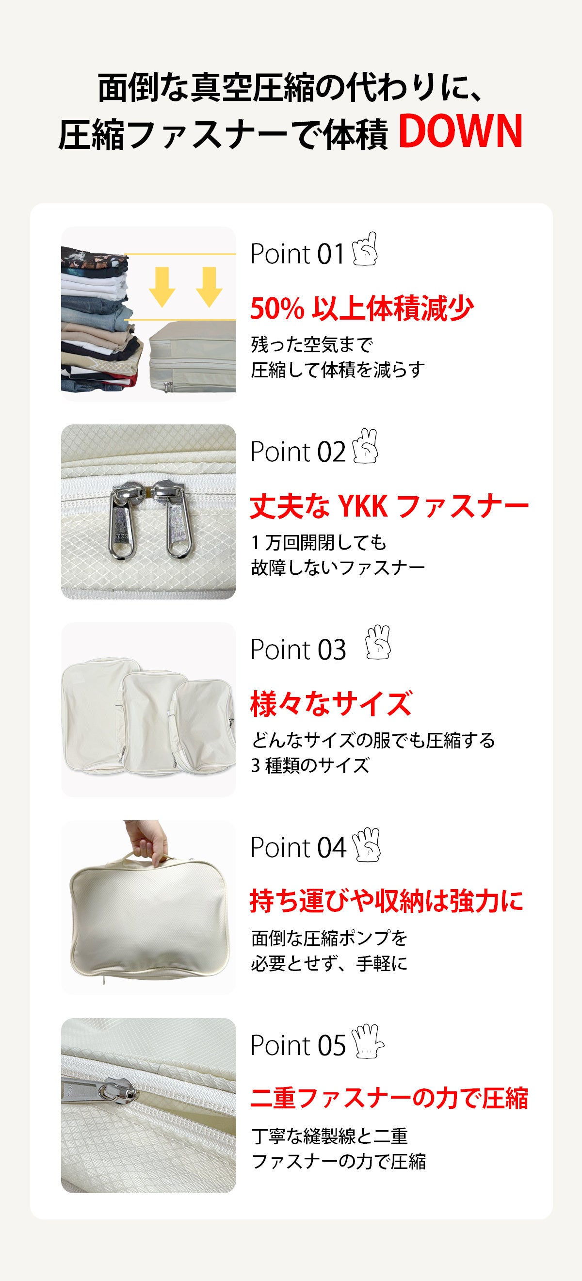 圧縮ファスナー一つで保管された衣類容量によって最大50%体積を減らし、衣類生地の損傷も心配ありません。