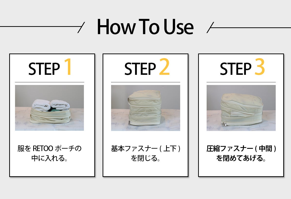 RETOO圧縮ポーチに(荷物)いれて、(ファスナーを)回すだけ!