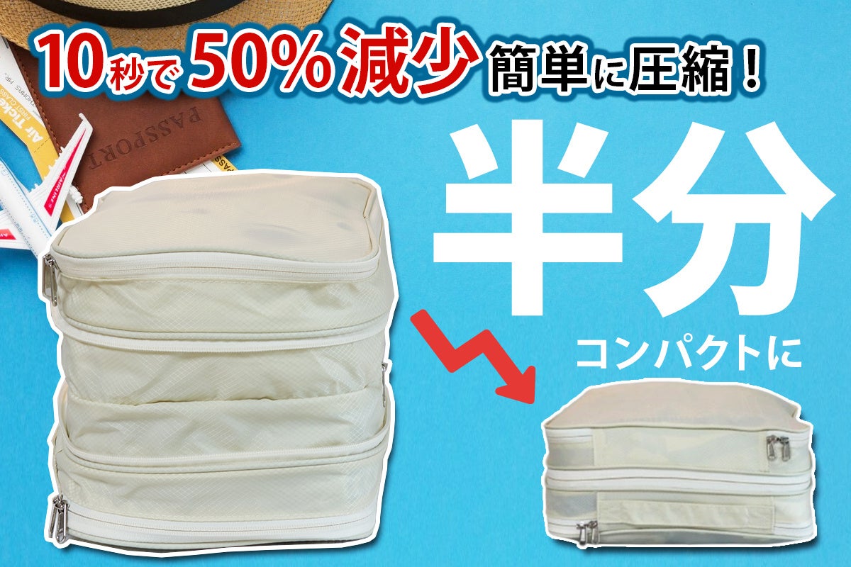 旅行用品、アウトドア用品、スーツケースの開発・販売を行う、株式会社レツジャパンが今回『圧縮収納ポーチ』を発売されました。大容量・驚異の圧縮力で、旅行や出張の荷物が半分の大きさで収まることができるます。