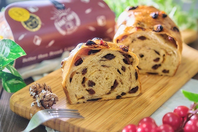 ふっくら果肉のレーズンの豊かな甘みと、生食パンのもちもちふわふわな食感がなじんで、一口食べた瞬間に誰もが笑顔になるレーズン食パン。
