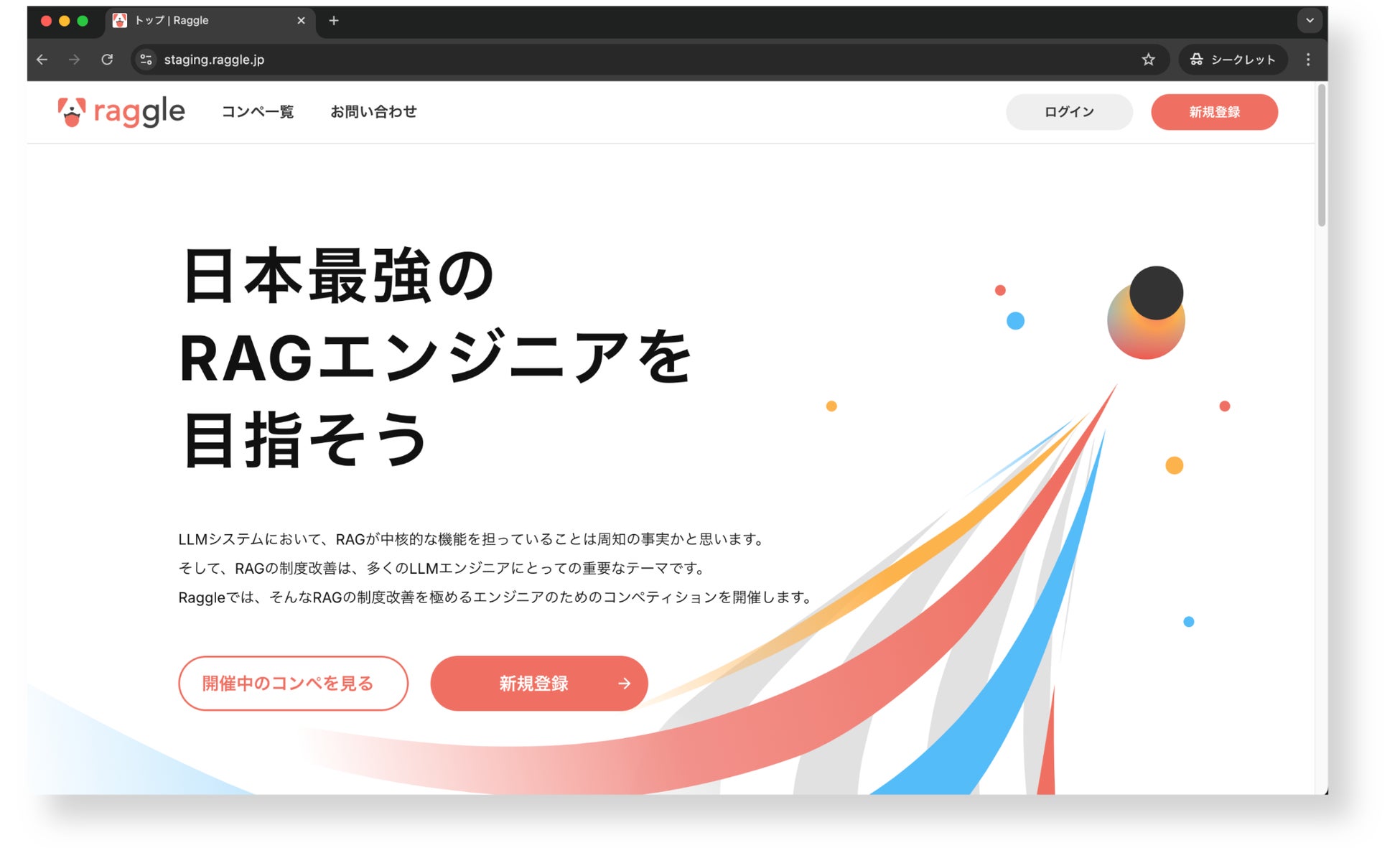 Raggleは、Retrieval-Augmented Generation(RAG)の性能改善(特に、精度改善)をテーマにしたコンペティションに特化したコンペプラットフォームです。生成AIエンジニア(RAGエンジニア)がそれぞれが醸成してきた知識と技術で、競い合いながら、社会的な実用性の高いシステムを構築する場を提供します。