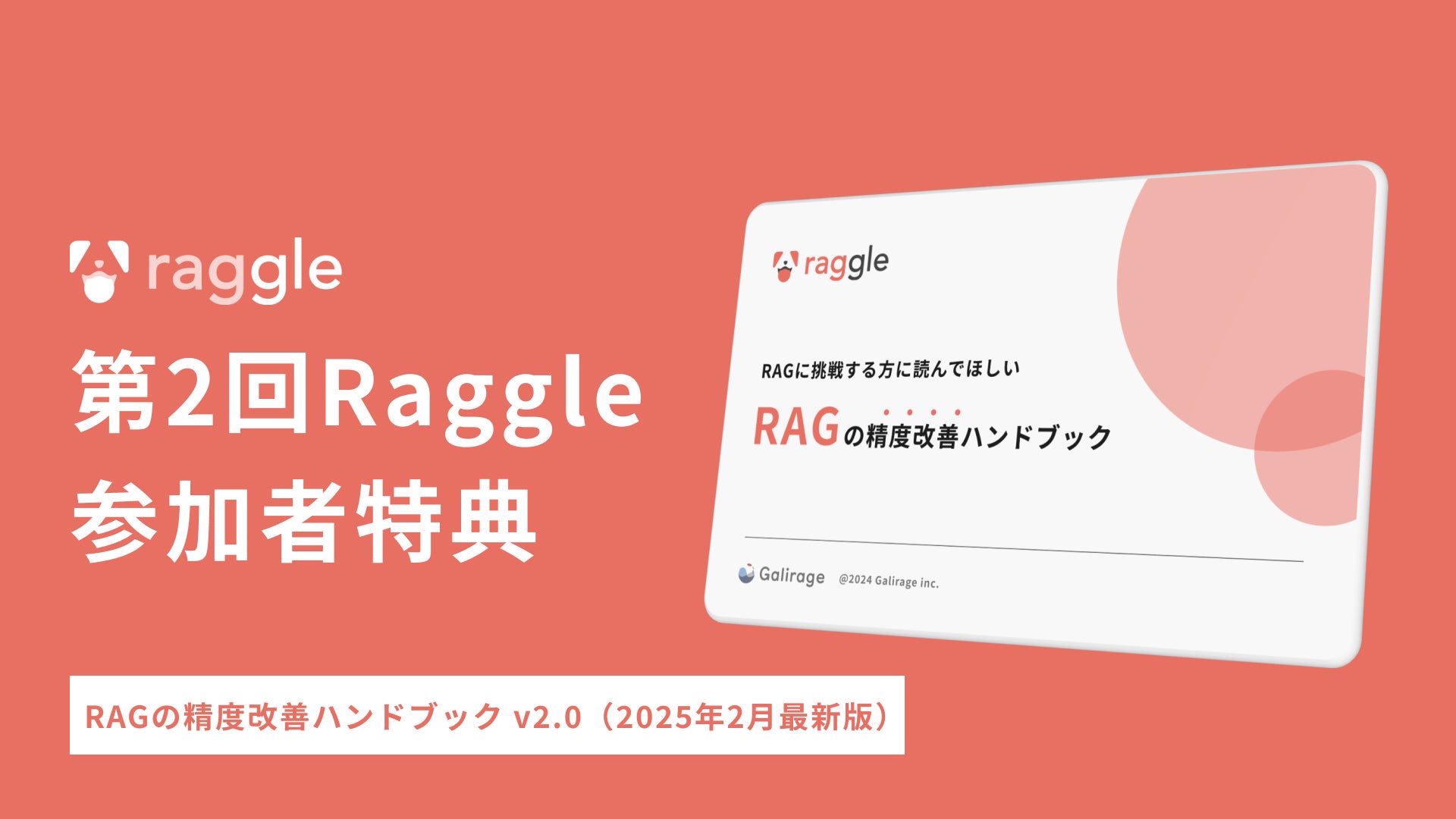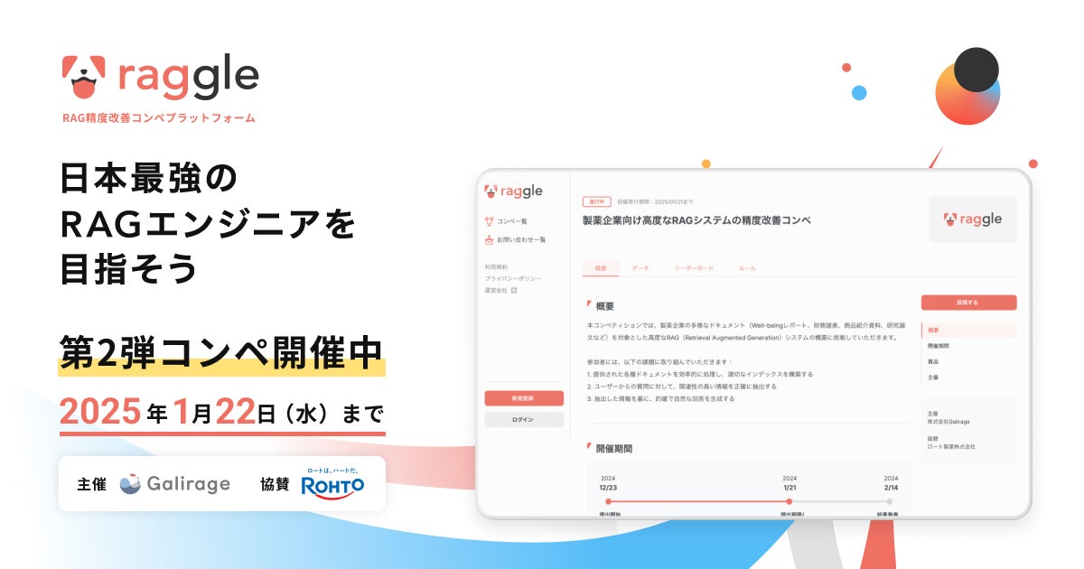 株式会社Galirage(本社:神奈川県川崎市、代表取締役:森重 真純、以下「Galirage」)は、ロート製薬株式会社(本社:大阪府大阪市、代表取締役社長:杉本 雅史、以下「ロート製薬」)の協賛のもと、Retrieval-Augmented Generation(RAG)技術の精度改善をテーマとした賞金制コンペティションプラットフォーム「Raggle」において、第2回コンペティション「製薬業界向けRAGシステムの精度改善コンペ」を2024年12月23日(月)より開催いたします。