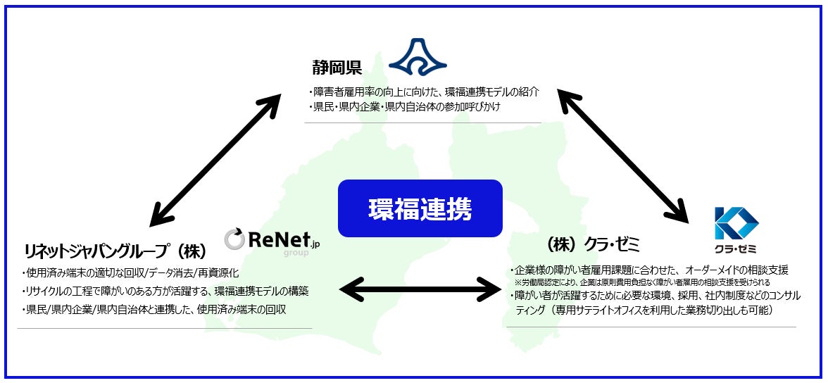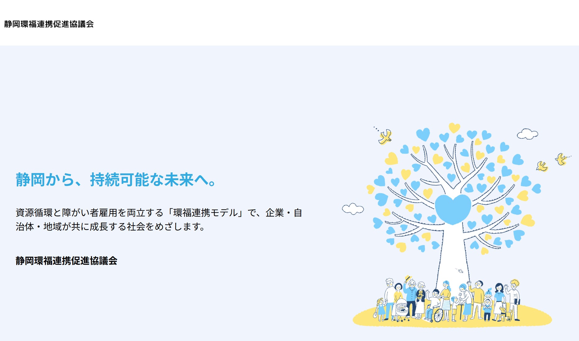 静岡県および県内市町と会員企業が連携し、環境活動と障がい者雇用促進に取り組むために、2025年11月1日(土)に『静岡環福連携促進協議会(以下、協議会)』を設立します。リネットジャパンとクラ・ゼミが事務局を務めるこの協議会を通して『環福連携』取り組みの情報共有・広報活動・会員の交流を促進し、環境と福祉が連携した持続可能な社会の実現に努めてまいります。