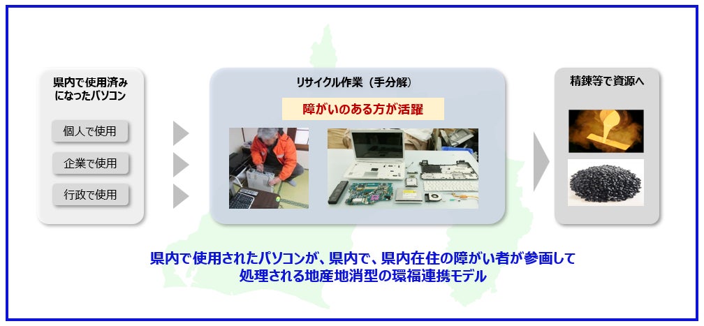 「県民・企業・自治体の使用済みパソコンの適正処分(都市鉱山の掘り起こし) 」と、「そのリサイクルに県内在住の障がい者が参画できる仕組み」を掛け合わせることで、資源の有効活用と障がい者雇用を企業規模に関わらずに叶えるのが、環福連携モデルです。静岡県が障がい者雇用率向上に向けた啓発活動、リネットジャパンが環境分野、クラ・ゼミが福祉分野を担うことで、地産地消型の環福連携を実現します。