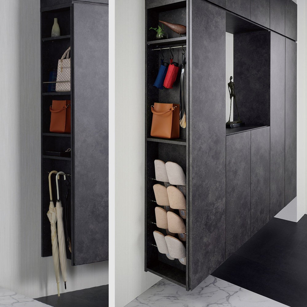 側面がオープン棚になっているアイテムには、小物を飾ったり、毎日使うバッグの置き場として使えるほか、ステンレスバーを追加すればスリッパを立てて収納できます。
