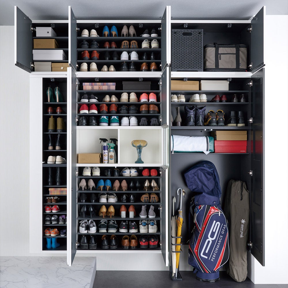 スニーカー、ハイヒール、ブーツなど高さの異なる靴の収納には、樹脂製棚板の位置を調整することで、デッドスペースを極力少なくすることができます。また底板がないキャビネットならベビーカーやキャリーケース、ゴルフバッグなどを収納でき、お出かけがスムーズに。