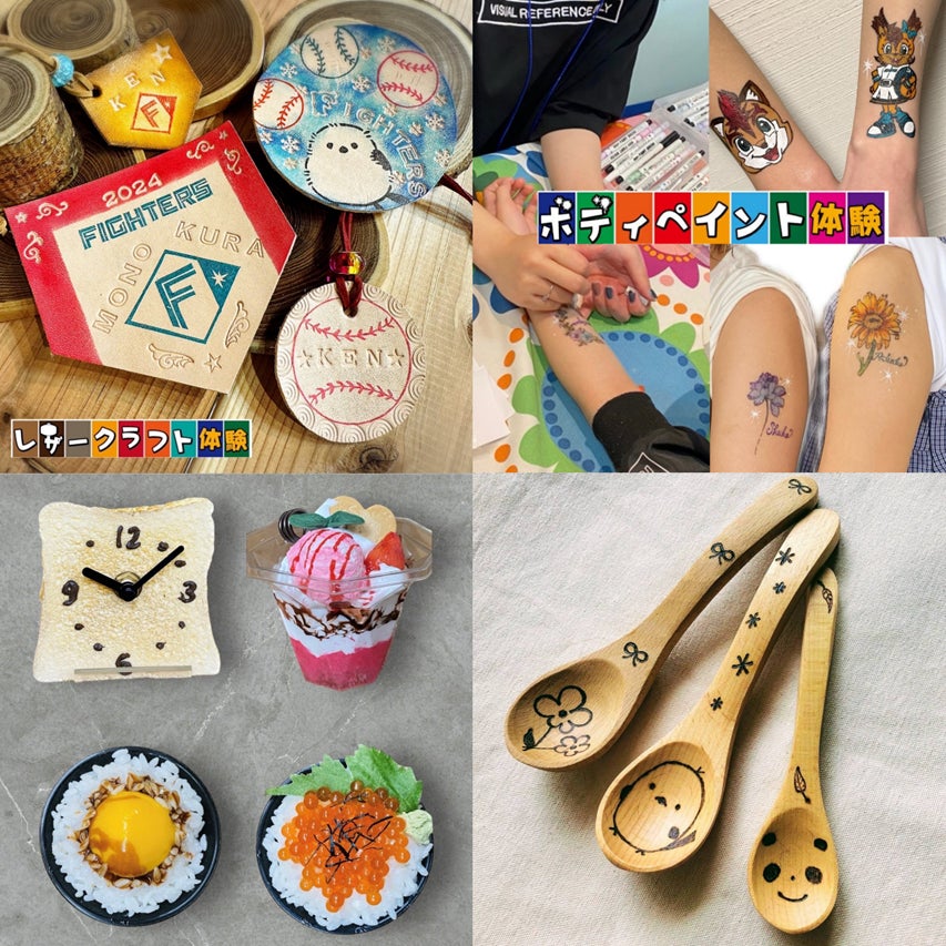 モノづくりの楽しさを伝える「函館モノクラフトマーケット」がエスコンフィールドに初登場。15名のクラフト作家によるオリジナルのレザークラフト体験やキャンドルやタイルを使ったコースター作り、食品サンプル作りなど自分ならではのオリジナルクラフト雑貨を作ることができます。体験中は、クラフト講師が優しく丁寧に教えてくれるので小さなお子様でも安心。イベント当日にしかできないボディペイントも体験できます。