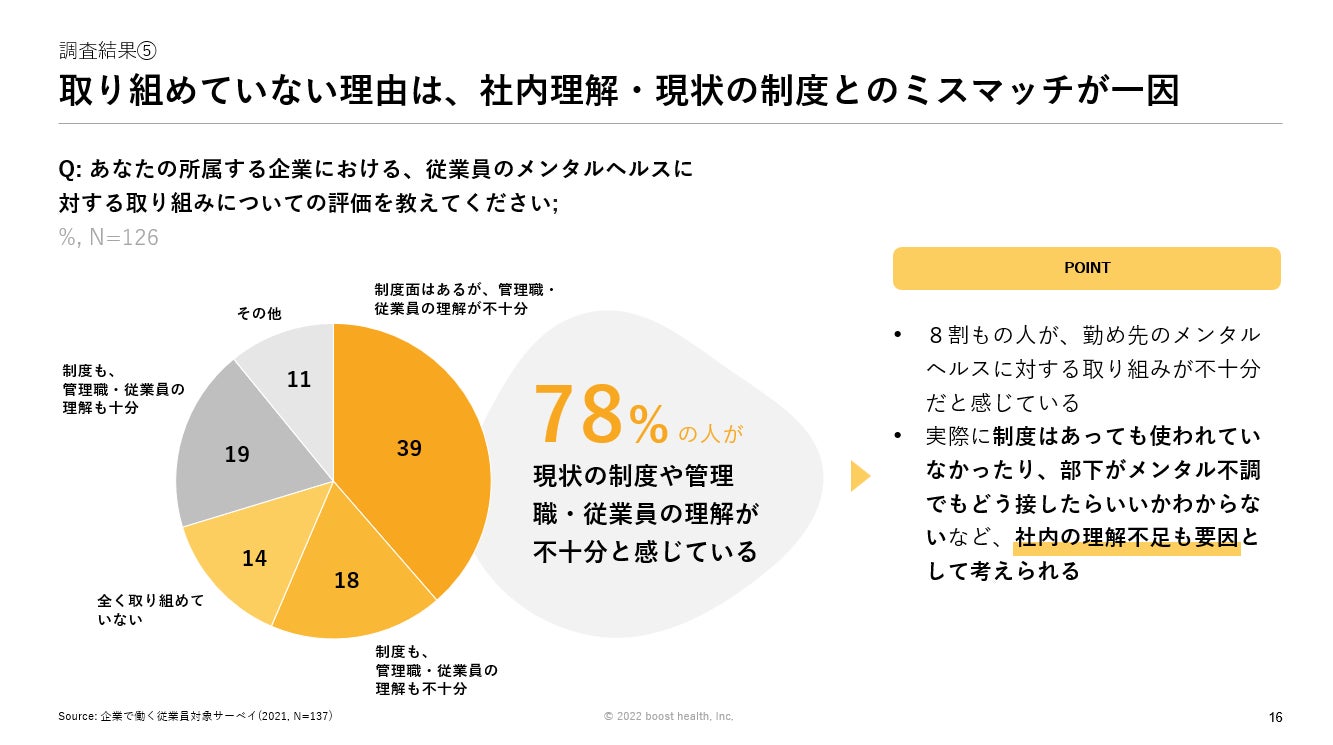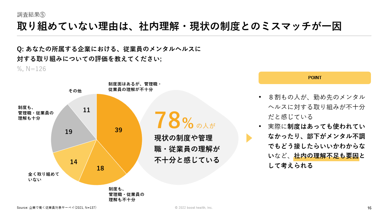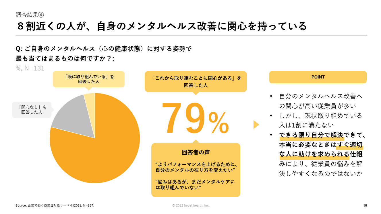 booost health株式会社は2021年11月に日本で働く企業従業員を対象にオンラインサーベイを実施しました。こちらの調査結果詳細も資料に掲載しております。
