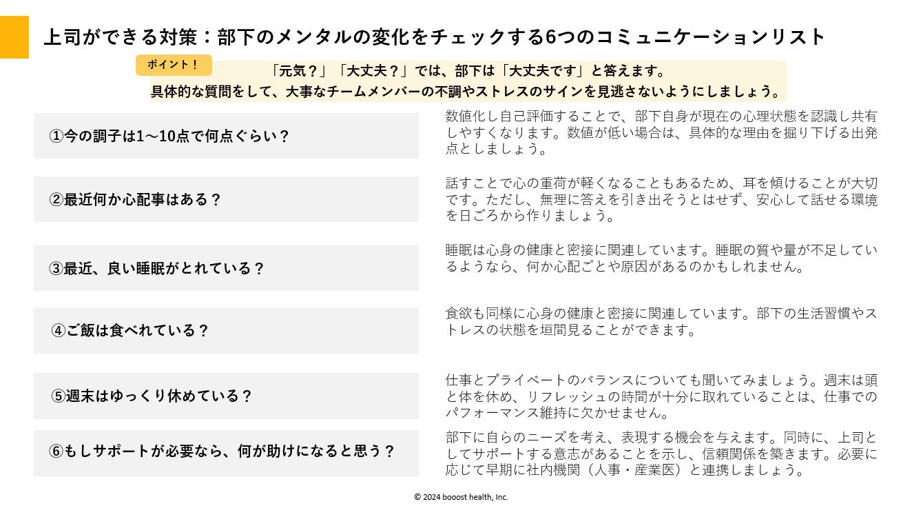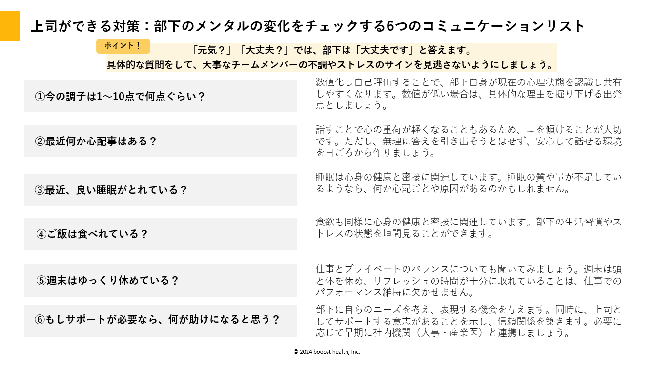 ①今の調子は1~10点で何点ぐらい? ②最近何か心配事はある? ③最近、良い睡眠がとれている? ④ご飯は食べれている? ⑤週末はゆっくり休めている? ⑥もしサポートが必要なら、何が助けになると思う? ※各項目の詳細は資料に掲載しております。 |