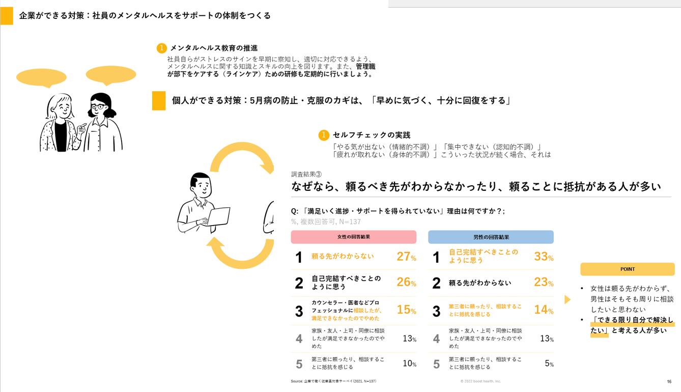 「従業員はどのような悩みを抱えているのか」「その悩みに対して十分なサポートを受けられているのか。また、現状の対策法に対する課題は何か」「理想的にはどのようなサポートを求めているのか」が調査結果で明らかになりました。