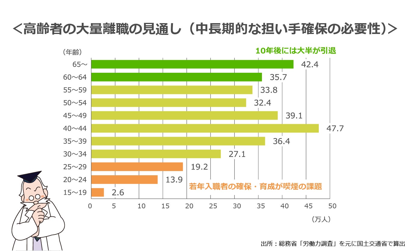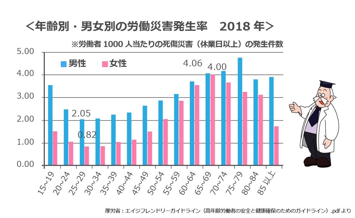 日本の総人口、特に若年齢層、生産年齢層の割合が減少していることから高年齢層の割合が上昇しており、働き手不足から定年後も危険な現場で働き続ける高齢者が増えてきております。