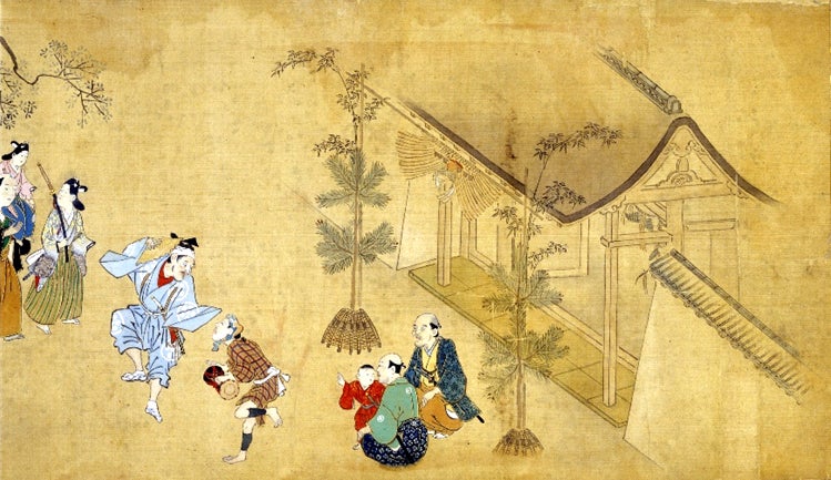 『四季風俗図巻』部分(伝菱川師宣筆/江戸時代/東京国立博物館蔵/出典:ColBase〈https://colbase.nich.go.jp〉)門松が飾られ万歳が舞う新年の光景が描かれています。