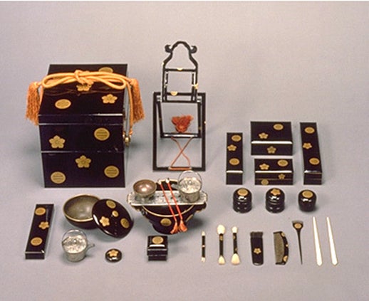 鉄漿は御歯黒のことで、御歯黒の道具とそれを収めた箱。御歯黒は成年式(成女式)を機に行われ、中世には女性だけではなく武士の間でも行われていました。