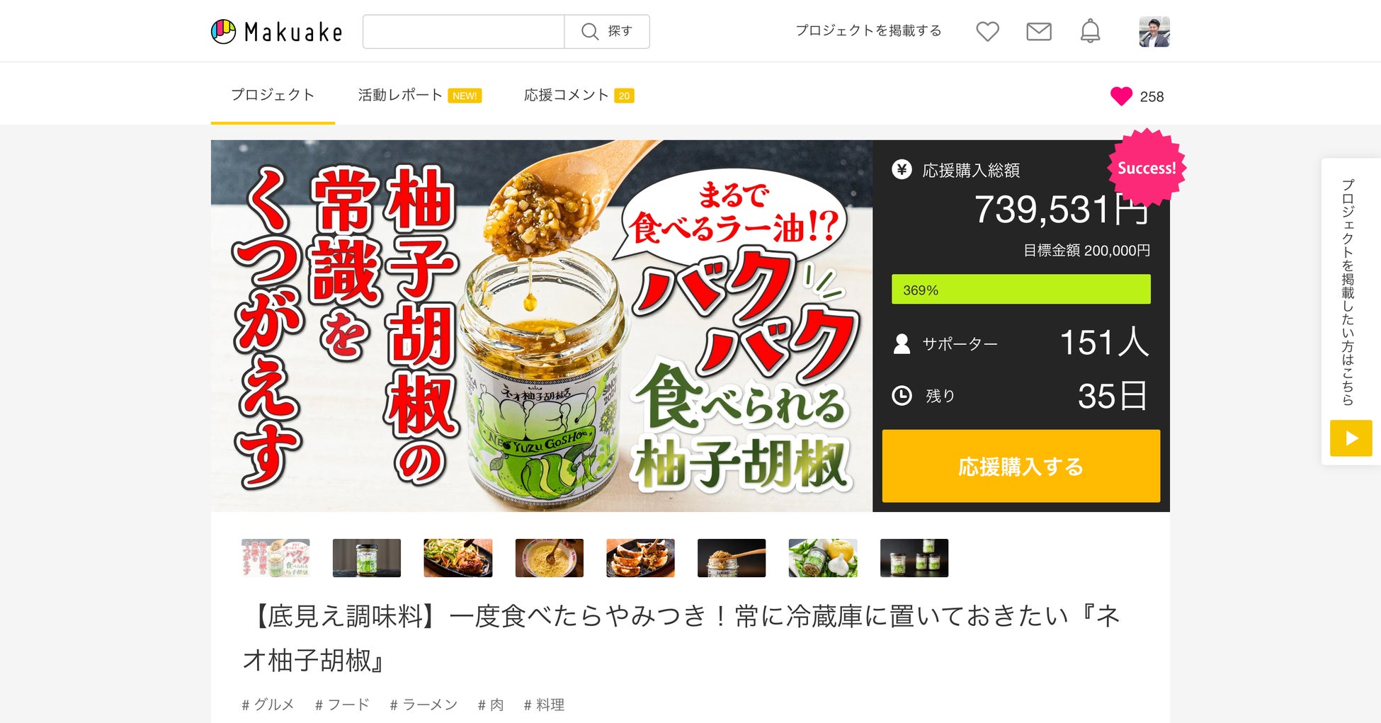 ~まるで食べるラー油のようにバクバク食べられる柚子胡椒『ネオ柚子胡椒』~クラウドファンディングサイト「Makuake(マクアケ)」にて、公開からわずか40分で目標金額を達成。先行販売は5/30まで!